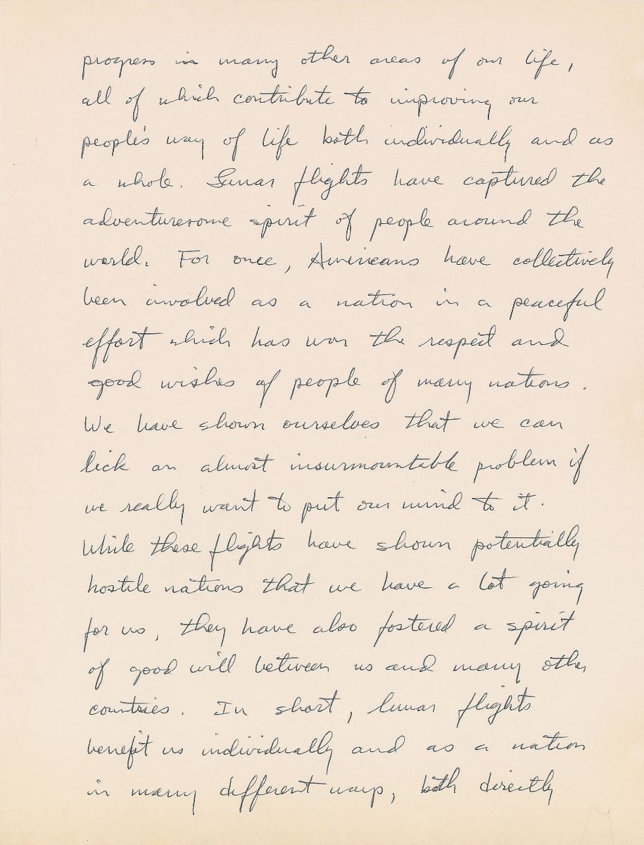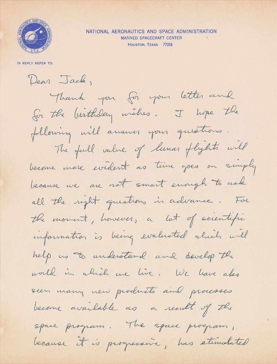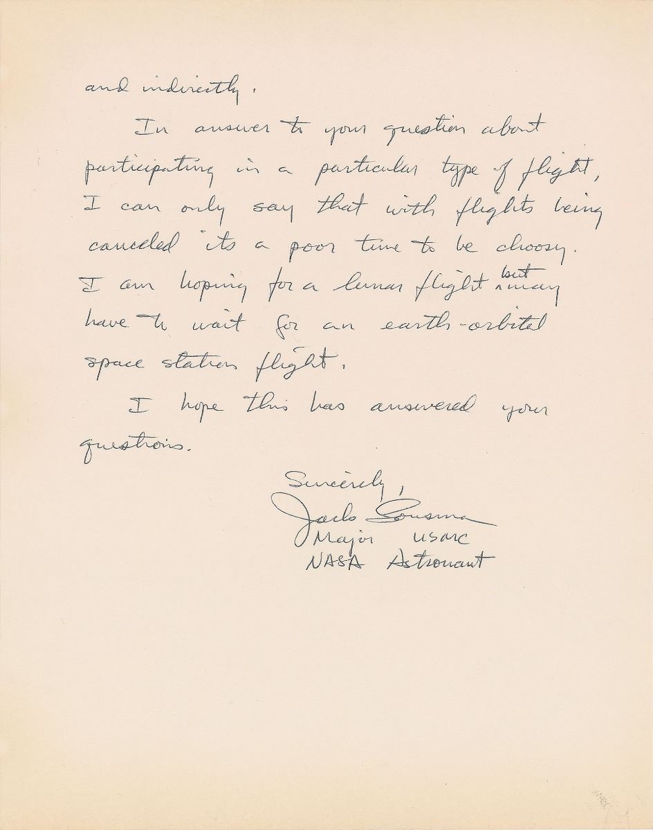 ALS signed “Jack Lousma, Major USMC, NASA Astronaut,” three pages, 8 x 10.5, NASA letterhead, no date. Letter to Jack, in part: “The full value of lunar flights will become more evident as time goes on simply because we are not smart enough to ask all the right questions in advance. For the moment, however, a lot of scientific information is being evaluated which will help us to understand and develop the world in which we live. We have also seen many new products and processes become available as a result of the space program. The space program, has stimulated progress in many other areas of our life, all of which contribute to improving our people’s way of life both individually and as a whole. Lunar flights have captured the adventuresome spirit of people around the world. For once, Americans have collectively been involved as a nation in a peaceful effort which has won the respect and good wishes of people of many nations. We have shown ourselves that we can lick an almost insurmountable problem if we really want to put our mind to it.” In fine condition.