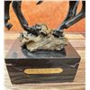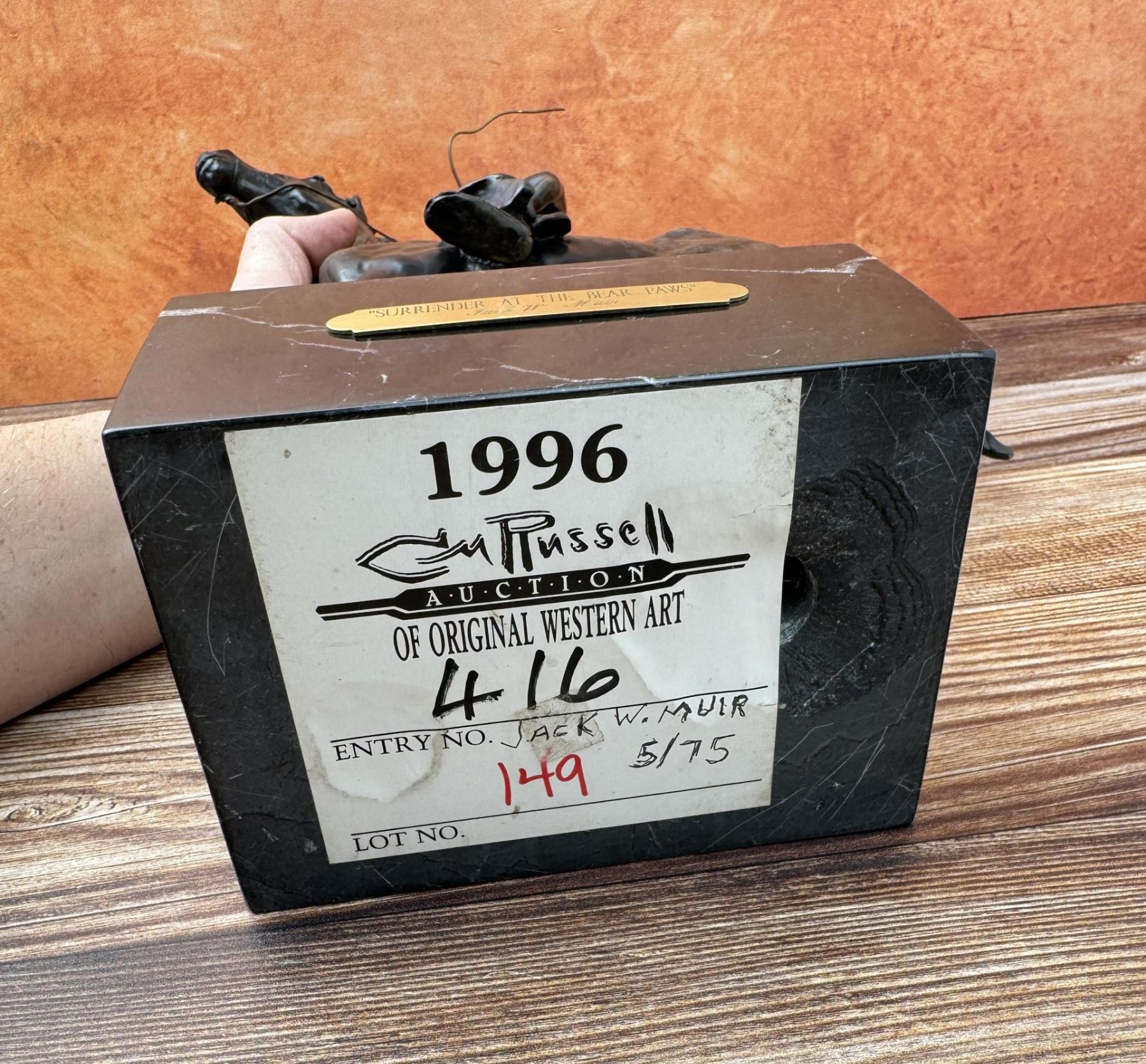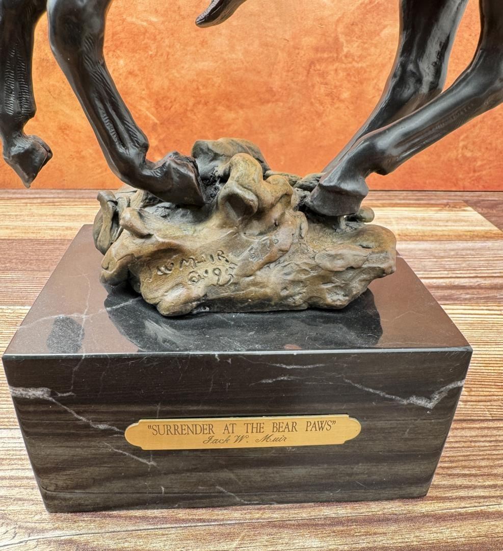 14 1/8" by 10 5/8" by 4 1/4". Title is Surrender at the Bear Paws. Jack W. Muir (Born 1947) is active/lives in Montana. Jack Muir is known for Sculptor-western figure/animal. A born and raised third generation Montanan, Western and Wildlife Sculptor, Jack W Muir resides on the beautiful shores of Flathead Lake, in the North West Corner of Montana, the setting for his home and studio. Wildlife and the mystique of the west abound in this part of Montana, both of which provide unlimited inspiration for Jack's work. After receiving a degree in Fine Art from Montana State University, Jack founded Kalispell Art Casting, established in 1978. Kalispell Art Casting is one of the largest and most respected art casting foundries in the west. Kalispell Art Casting sits on 2 acres with 20,000 square feet of floor space. Aside from casting his own art work, Jack casts for many prominent and well known artists including Sherry Salari Sander, Fred Fellows, Deborah Copenhaver Fellows, Bob Scriver and many other talented artists from across the United States and Canada. Kalispell Art Casting is known, not only for casting statuary bronzes of all sizes, the foundry is well known for the design, engineering, enlarging, casting, patination, delivery and installation of monumental sculptures. These monuments have been installed in noteable establishments across the country. These establishments include the Calagary Stampede grounds, the Boon and Crocket Club, the Parker Ranch in Hawaii, the Denver Zoo, the City of Olympia, Montana State University, State of Montana and several other locations. Jack's business association with many well known and respected artists for the past 35 years has been a tremendously rich education and influence in his own art work. Western, wildlife and equestrian are themes that prevail in Jack's work. However, subject matter is secondary to his main interest which is to focus on strong sculptural elements. Muir's sculptures exude emotion through subject matter and interest to the eye by use of composition, movement and texture. Jack's sculptures can be found in private collections throughout the United States, Canada and Europe and are available in fine art galleries across the country.