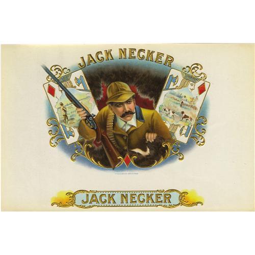 <B><I>Jack Necker</B></I></B></I><B> Bird Hunting Cigar Label.</B></I> Full color lithographed 9.75" x 6.5" inner label with gold-embossed brand name and highlights. Probably named after period slang, Jack Necker cigars are here personified by a hunter armed with a double-barreled shotgun. He is flanked by two Jack of Diamonds playing cards upon which are scenes of birding with dogs in open fields. Excellent condition. This label is listed as one of the "InStone 100" blue chip cigar labels.<BR><BR><b>Shipping:</b> Small Flat (<a target="_blank" href="http://www.heritageauctions.com/common/shipping.php">view shipping information</a>)