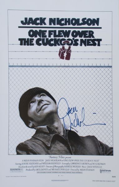 Reproduction souvenir poster from One Flew Over the Cuckoo's Nest, 11 x 17, signed in blue felt tip. In very fine condition.