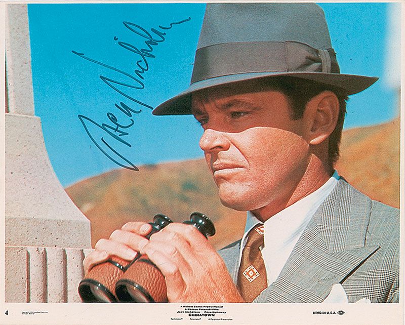 Two color 10 x 8 cardstock Paramount promotional photos for Chinatown, one signed in black felt tip by Nicholson, the other signed in blue felt tip by Dunaway, which also bears an additional secretarial signature in black felt tip. In fine condition.