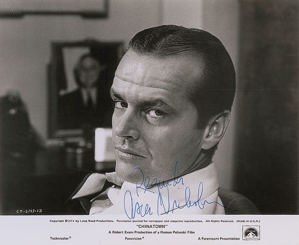 Glossy 10 x 8 Paramount promotional photo for Chinatown, signed in blue felt tip. In fine condition.