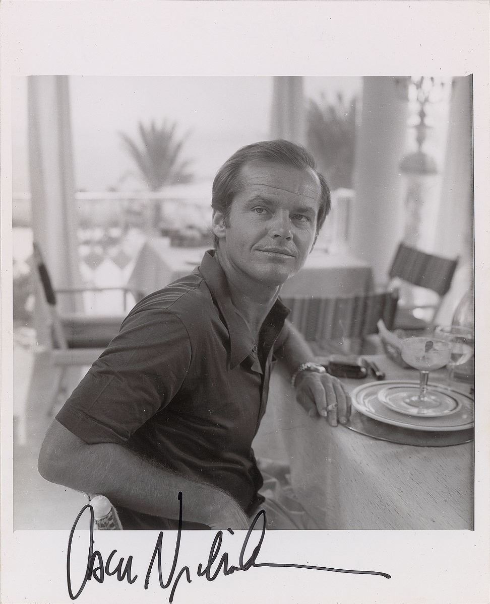 Excellent glossy 8 x 10 half-length photo of Nicholson seated at a table and smoking a cigarette, signed in the lower border in black felt tip. In fine condition.