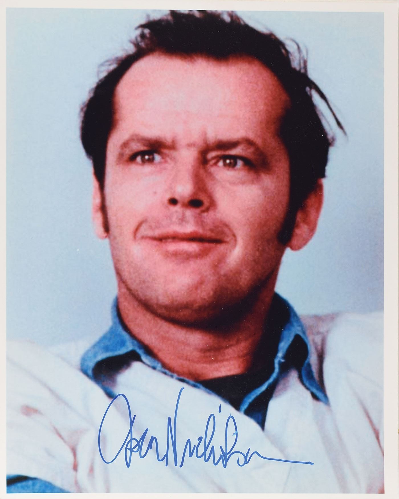 Color satin-finish 12 x 15 close-up photo of Jack Nicholson in his Oscar-winning role as R. P. McMurphy from the 1975 film One Flew Over the Cuckoo’s Nest, signed in blue felt tip. In very fine condition, with a slightly grainy quality to image.