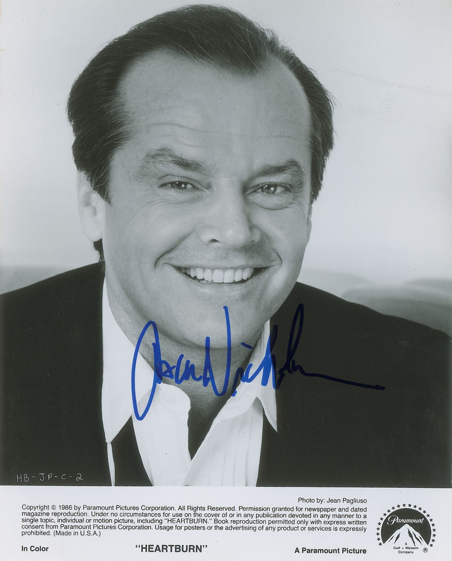 Glossy 8 x 9.75 Paramount Pictures publicity photo of Jack Nicholson for the 1986 romantic comedy Heartburn, signed in blue felt tip. Reverse bears an affixed Paramount caption. In very good condition, with irregularity to the emulsion over Nicholson's forehead.