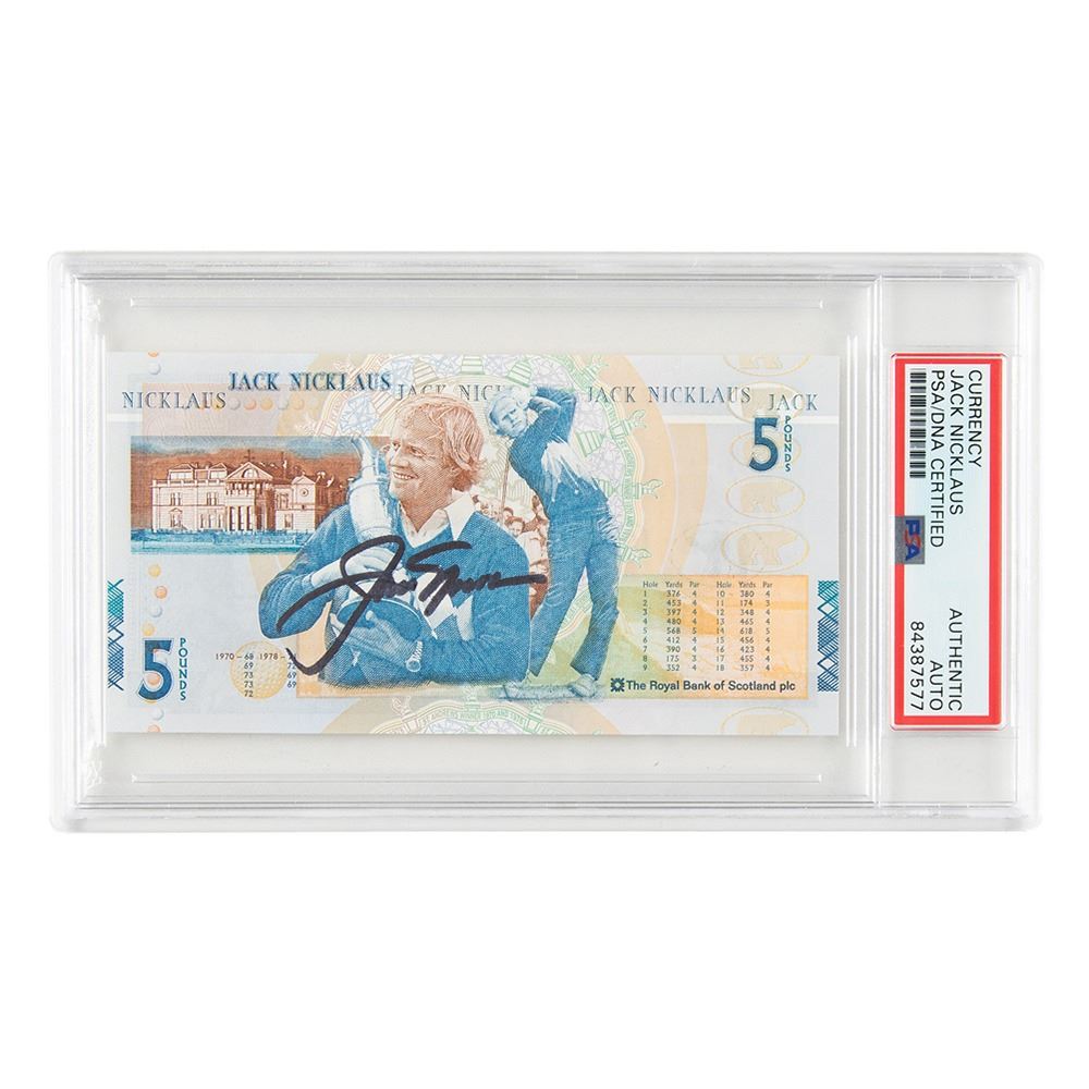 2005 Royal Bank of Scotland plc five pound sterling banknote, 5.25 x 2.75, signed over his likeness in black felt tip by Jack Nicklaus. In fine condition. Encapsulated in a PSA/DNA authentication holder.