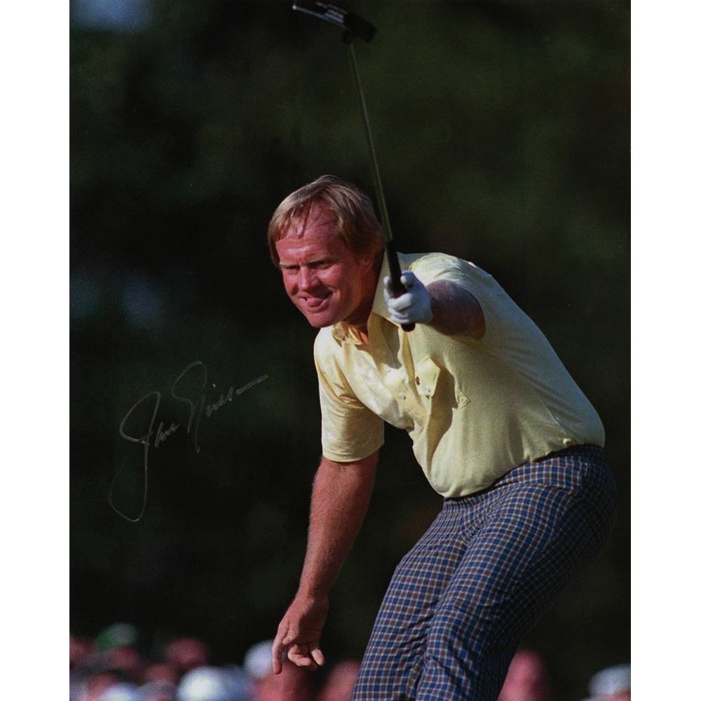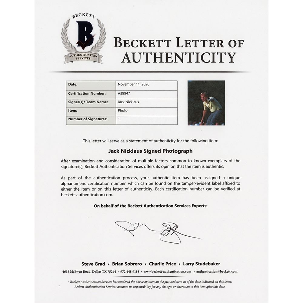 Color satin-finish 8 x 10 photo of Jack Nicklaus intensely watching a putt roll to the cup, signed in silver ink. In very good to fine condition, with two light creases across the bottom. Accompanied by a full letter of authenticity from Beckett Authentication Services.
