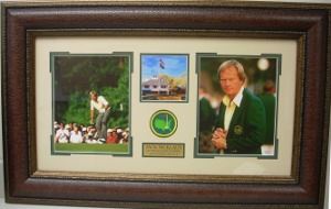 Jack Nicklaus, also known as "The Golden Bear", is regarded by many as the greatest professional golfer of all time. Over the course of this 25-year period of 100 major championships as a professional, Nicklaus finished either first or second 36 times, in the top three 45 times, the top five 54 times, and the top 10 67 times. This is a Jack Nicklaus 6 Time Masters unautographed 2 Photo Leather Framed Piece. Framed Piece also has Masters Clubhouse Photo and Masters Patch custom matted. Approx: 21x34