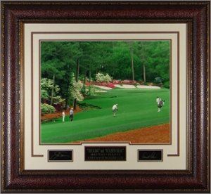 Arnold Palmer is generally regarded as one of the greatest players in the history of men's professional golf. Nicknamed "The King," he is one of golf's most popular stars and its most important trailblazer because he was the first star of the sport's television age, which began in the 1950s. Jack Nicklaus, also known as "The Golden Bear" was continuously ranked as the world's number one golfer on McCormack's World Golf Rankings from its inception in 1968 to 1977. This is an Arnold Palmer and Jack Nicklaus custom premium leather framed unautographed Signature Engraved oversize 28x34 piece. Unique collectible of two of the all time golf greats with special engraved signature plates.