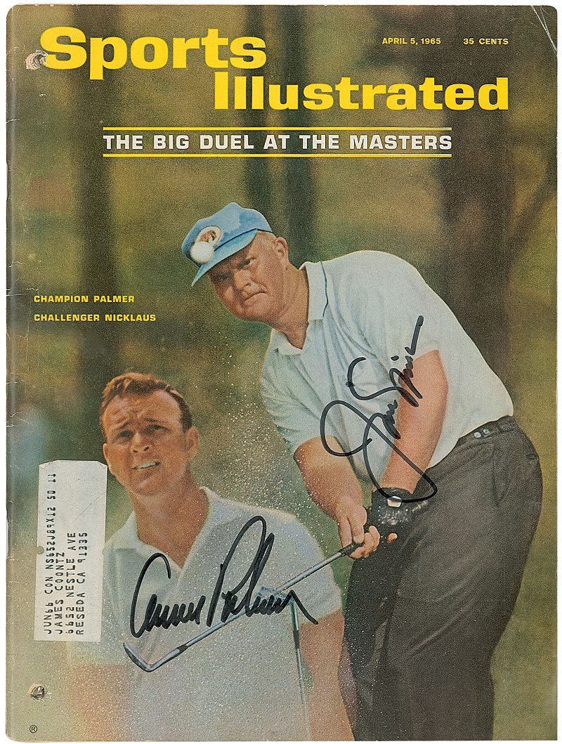 Sports Illustrated magazine from April 5, 1965, featuring Nicklaus and Palmer preparing for the Masters, signed on the cover by both in black felt tip. In very good condition, with punch holes along left edge, some light creases, and a mailing label to lower left.