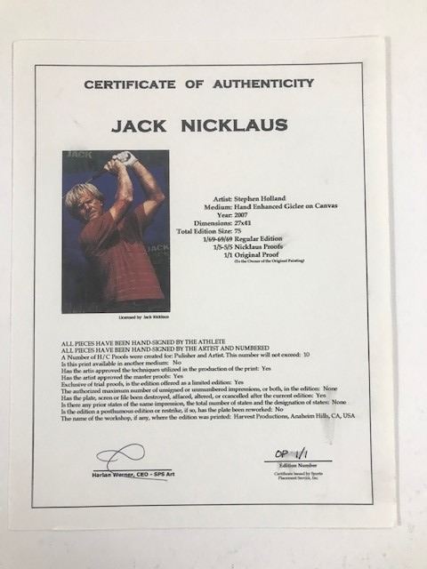 "Jack Nicklaus" by Stephen Holland - Limited Edition Original Proof #1 of 1 Hand Enhanced Giclee on Canvas 33"x48" framed