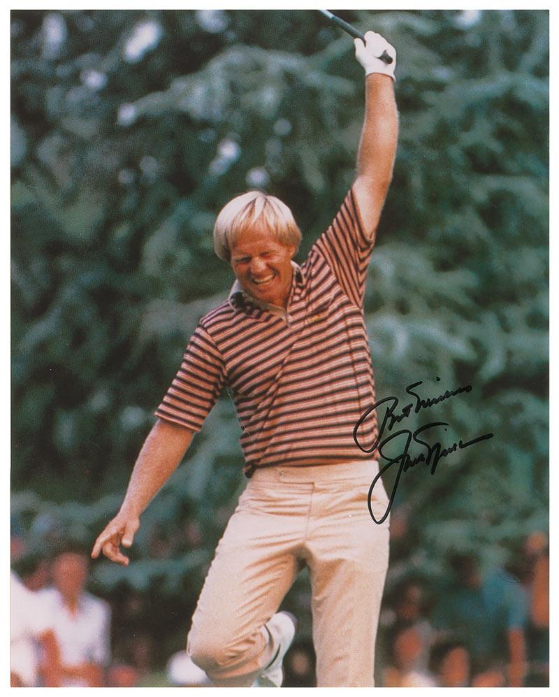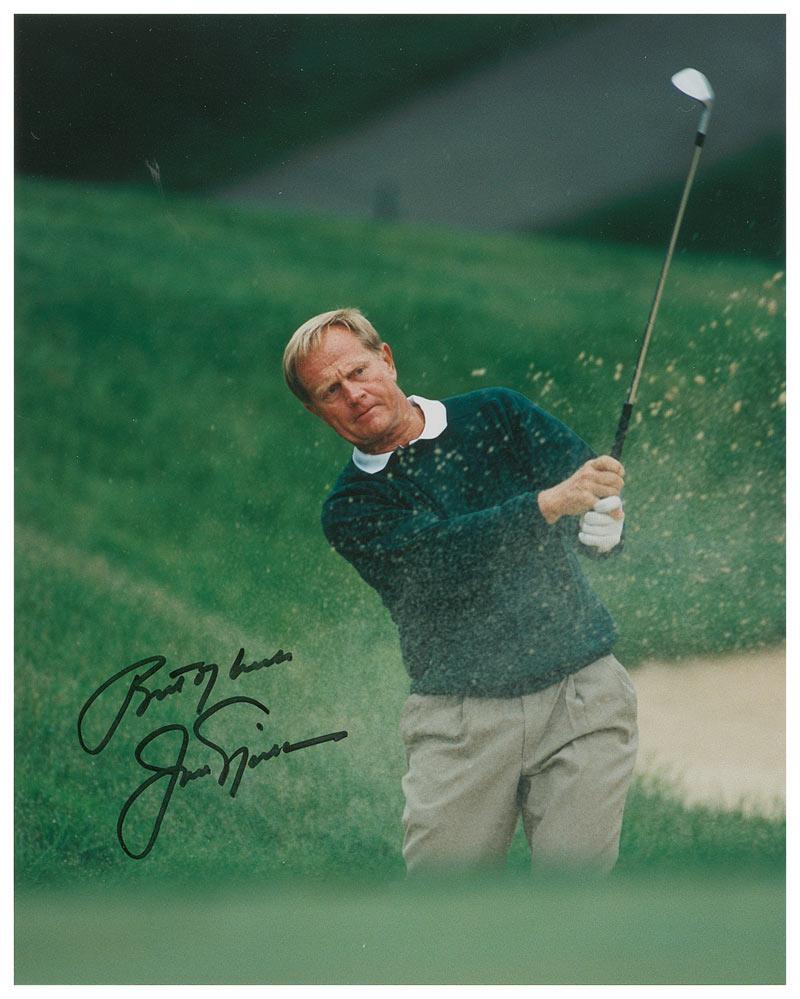 Two color 8 x 10 photos of Nicklaus on the course, one glossy and one satin-finish, each signed in black felt tip, with Nicklaus adding a brief sentiment to each photo. In fine condition, with a carefully removed inscription to the glossy photo.