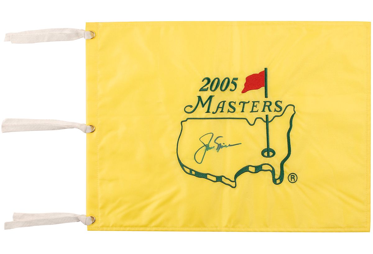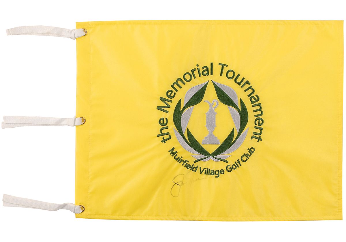 Two bright yellow 17.75 x 13 gold flags: one from the 2005 Masters, signed in blue felt tip; the other from the Memorial, signed in black felt tip. In very good condition, with brushing to one signature and other signature light and faded, but still legible. The Masters flag is accompanied by a full letter of authenticity from PSA/DNA.