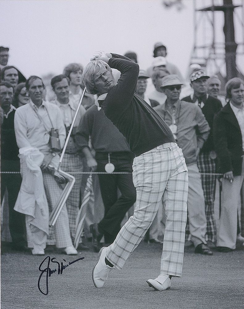Satin-finish 11 x 14 photo of Nicklaus following his tee shot, signed in black felt tip. In very fine condition.