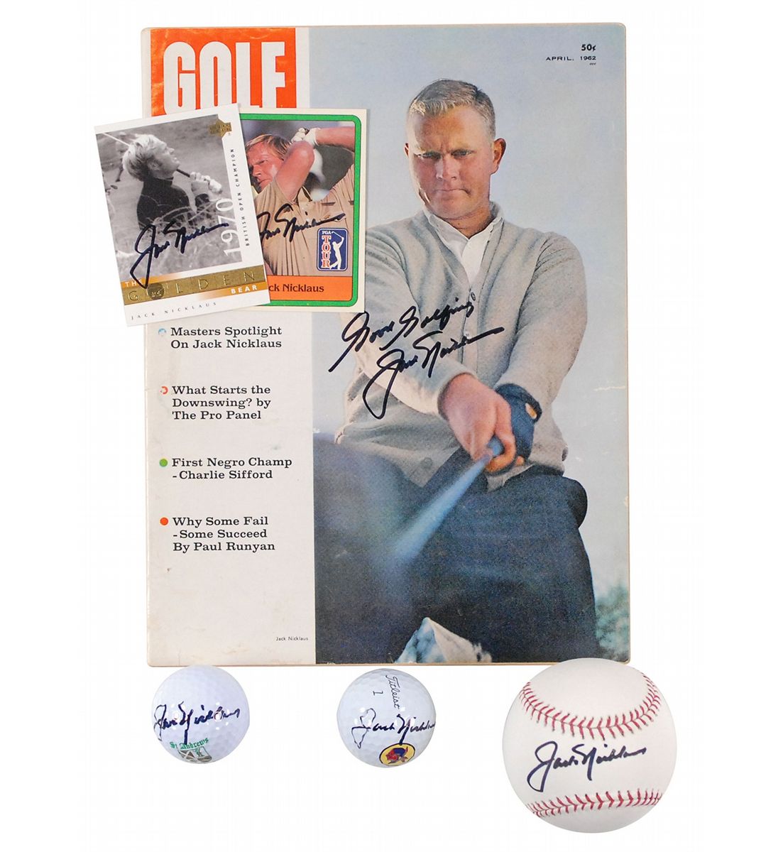 Collection of six items, each signed in black felt tip by Nicklaus, including: an official Rawlings Major League baseball; a 1962 Golf Digest magazine; two golf balls; and two trading cards. In overall fine condition.