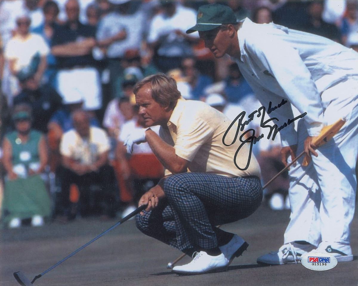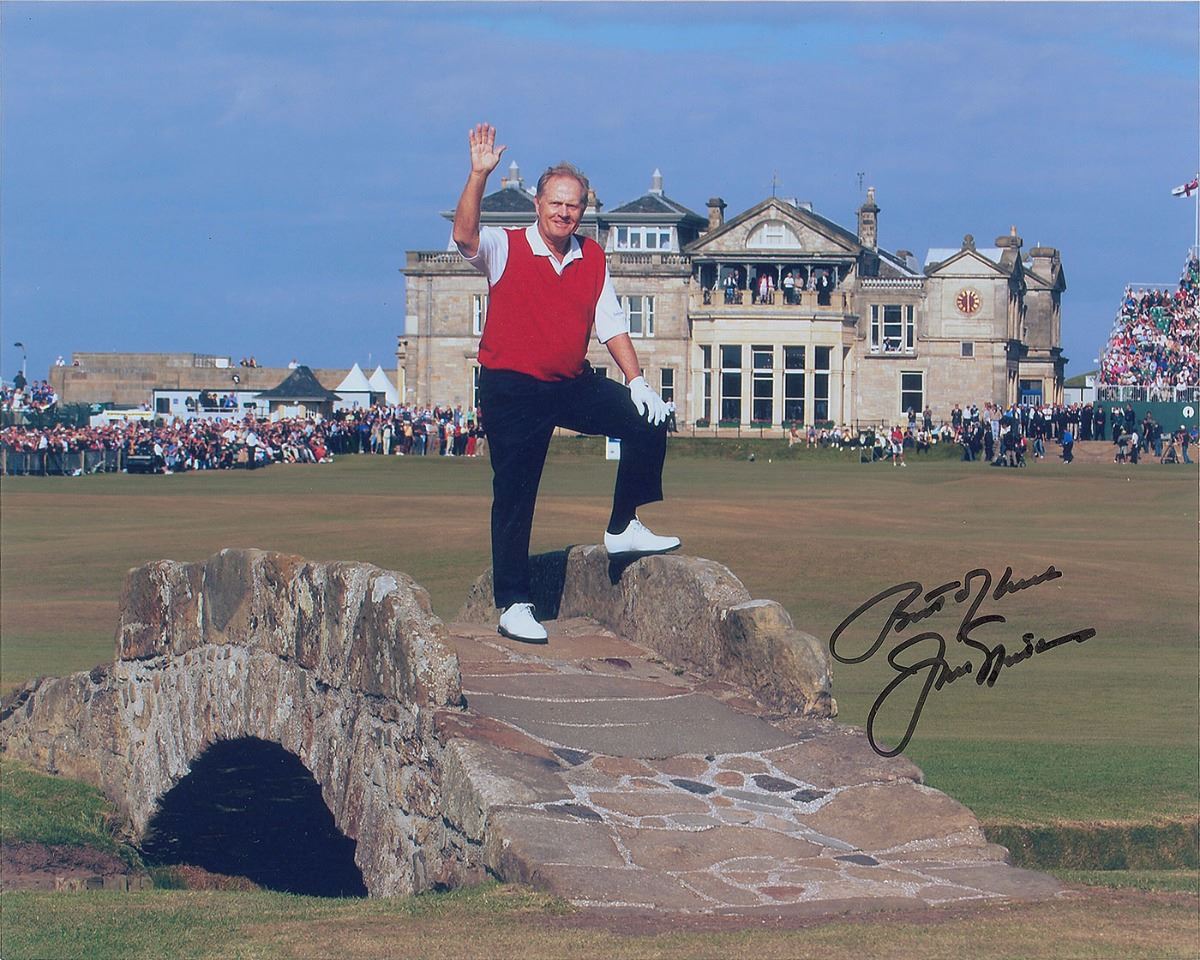 Two color satin-finish 10 x 8 photos of Nicklaus, one during his prime and the other in later age, both signed in black felt tip, “Best of luck, Jack Nicklaus.” In overall fine condition.