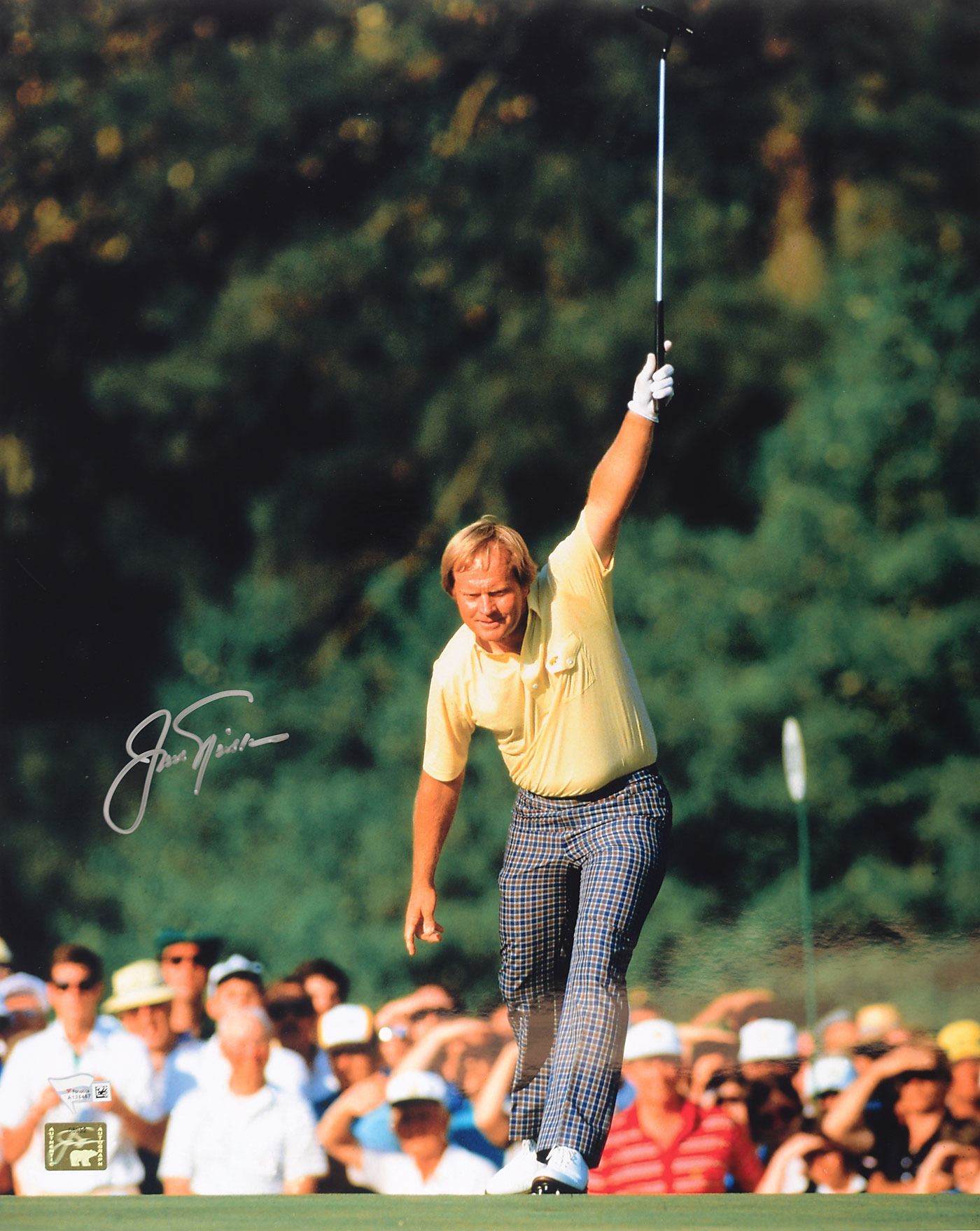 Crystal-clear color glossy 16 x 20 full-length photo of Jack Nicklaus celebrating as he rolls in a birdie putt during his victory charge at the 1986 Masters, signed in silver ink. In fine condition, with authenticity labels affixed to lower left corner.