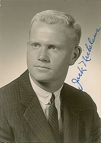 Desirable vintage matte-finish 2.5 x 3.5 portrait of Jack Nicklaus as a 19-year-old undergrad at Ohio State University, signed neatly in blue ballpoint. Typed notation to reverse dates the signature to 1959. In very good to fine condition, with creasing across the bottom. Accompanied by the original mailing envelope, postmarked October 6, 1959. While attending Ohio State, Nicklaus twice won the U.S. Amateur (1959 and 1961), and he cemented his collegiate legacy with an NCAA Division I Men's Golf Championship in the year of his graduation. In the 1959 U.S. Amateur, Nicklaus defeated two-time winner and defending champion Charles Coe 1-up in the final 36-hole match when he birdied the 18th hole. Photos signed by Nicklaus from this early period are exceedingly scarce and highly sought after.