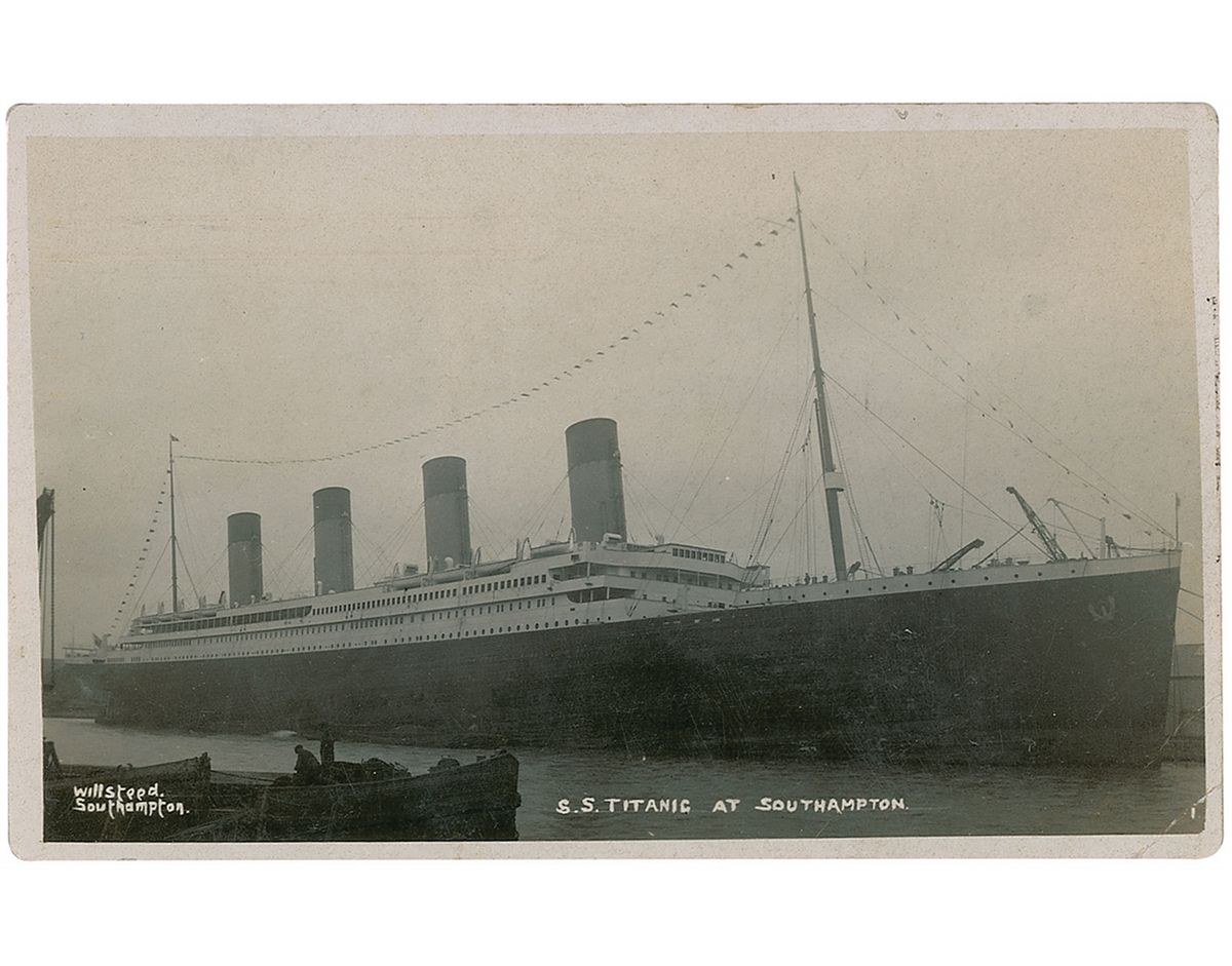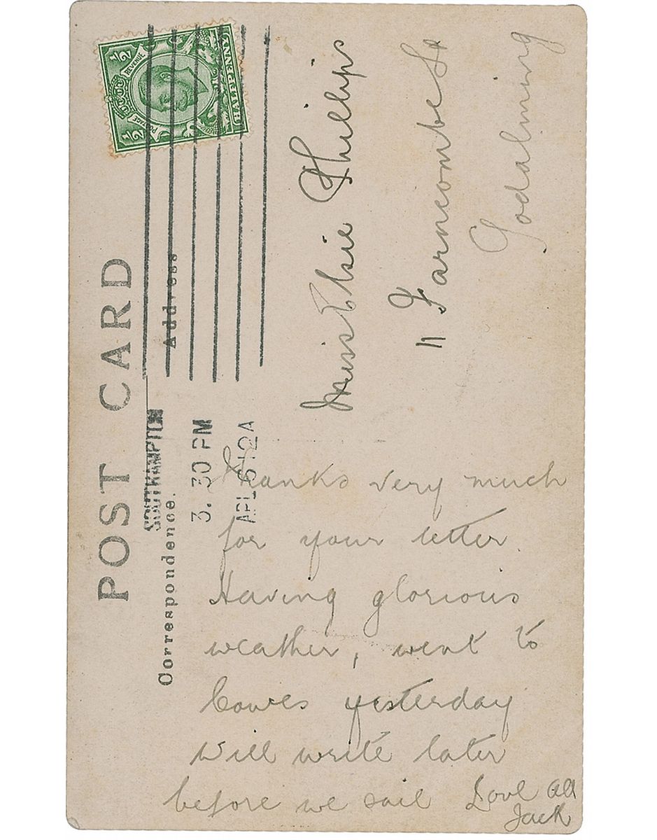 During his career, Phillips kept in frequent touch with his sister, Elsie, and she saved almost 300 postcards he sent to her during this time. This card, however, holds particular significance as it was written on April 6, 1912 while Titanic was docked in Southampton, and contains an image of the ship. Phillips often chose postcards which depicted the ship on which he served, yet only four of the 300 postcards retained by Elsie had any relation to Titanic—and only one, this one, illustrated the ship. Add to that the direct reference to the upcoming voyage and this is a remarkable item in every sense.