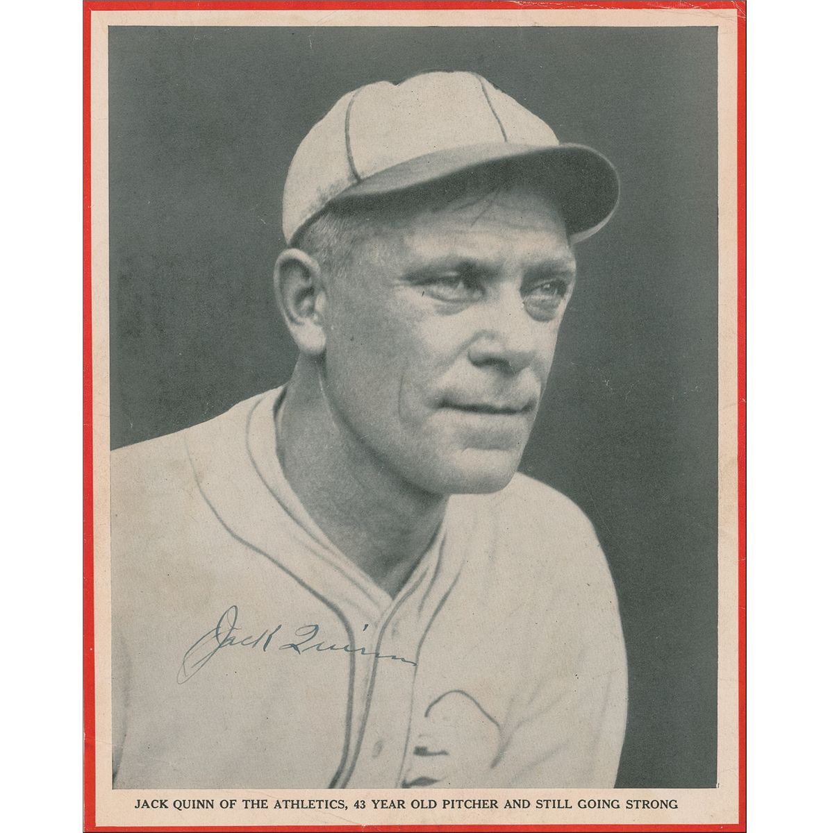 Major League pitcher (1883–1946) who made his final appearance at the age of 50. Vintage 8.25 x 10.25 photo taken from the inside cover of a sample copy of Baseball magazine, signed in fountain pen. Scattered creases and surface marks, as well as some light wrinkling, otherwise fine condition.