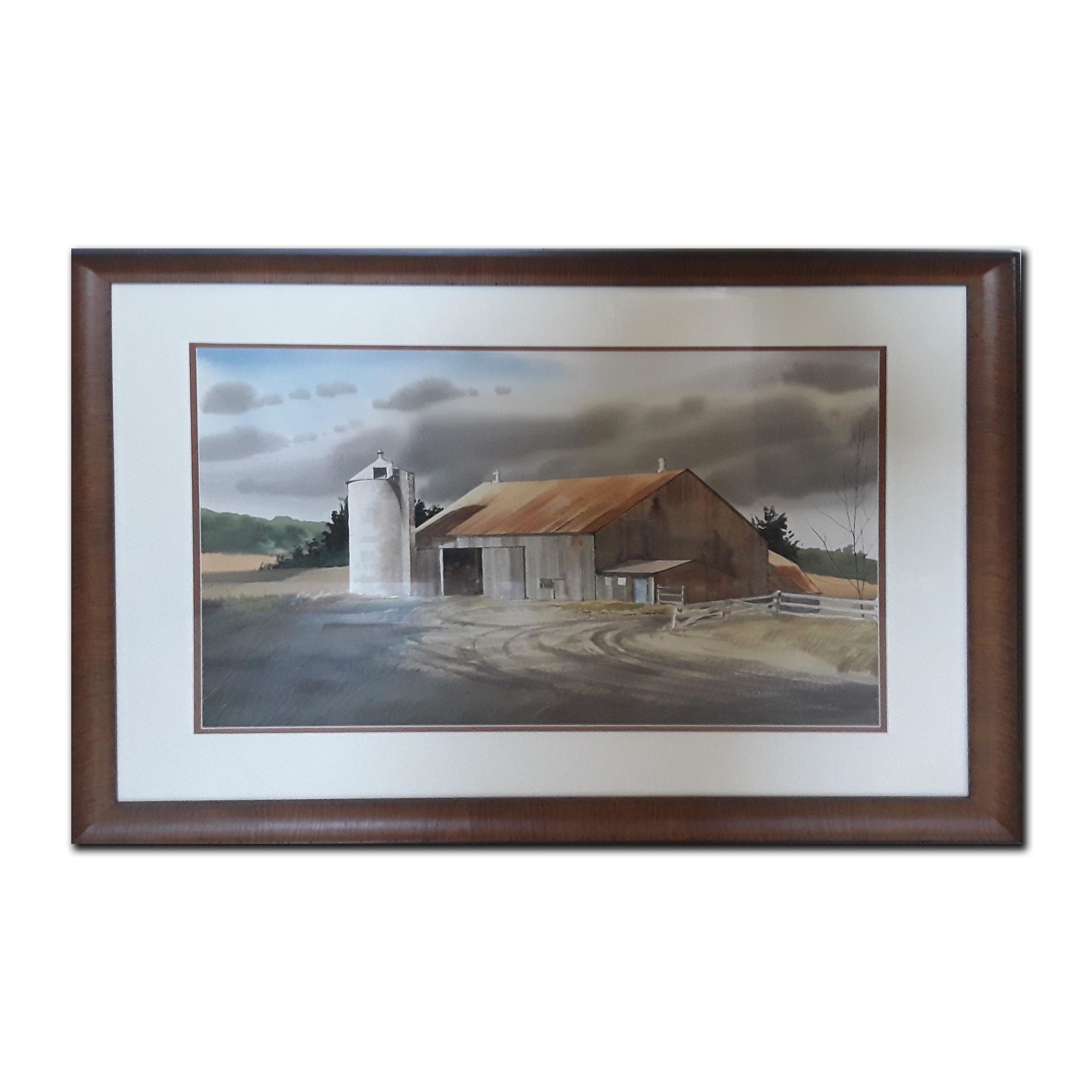 Jack Reid's 'Barn'. This is an original watercolour of a barn and a silo on a farm. This beautiful painting of a barn is some of Jack Reid's best work. This piece has been professionally custom matted and framed under glass.Image- 20 1/2" x 28 3/4". Frame- 32" x 40"
