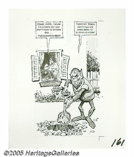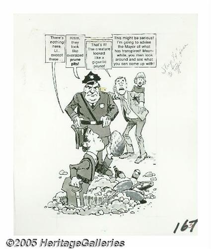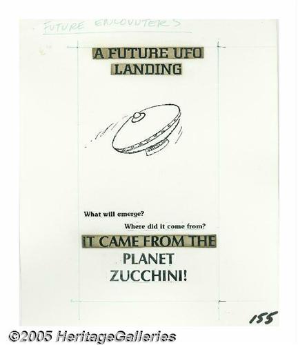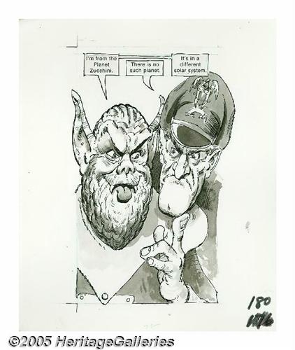 <B>Jack Rickard - "A Mad Look at the Future," Complete 38-page Story "It Came From the Planet Zucchini" Original Art (Warner Books, 1978).</B></I> Writer Lou Silverstone and artist Jack Rickard offer this <B>Mad</B></I> take on an alien invasion from the planet Zucchini. Good Lord --choke! The art is drawn in ink and accented with ink wash tones. Each page of this science fiction spoof has an approximate image area of 5.25" x 9.5", and is in Excellent condition.