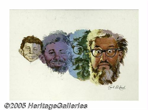 <B>Jack Rickard - Alfred E. Neuman Morphing into William Gaines Caricature Illustration Original Art (undated).</B></I> Good Lord -- choke! In just four quick steps, Alfred E. Neuman evolves into <B>Mad</B></I> publisher and EC Comics Grand Poobah William Gaines! Hoo-<I>hah</B></I> -- only an artist as talented as Jack Rickard could make such a change seem so natural, so right. The image area of this gouache on illustration board painting is approximately 16" x 10", and the art is in Excellent condition.