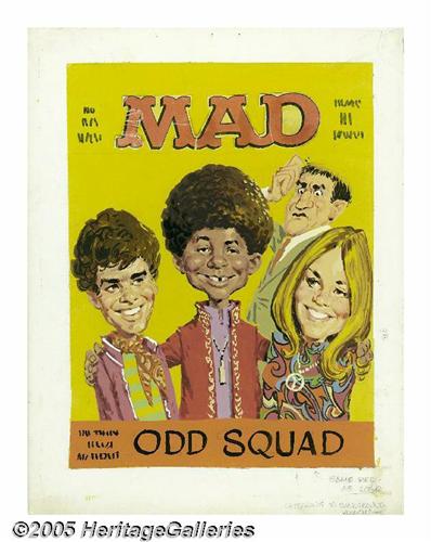 <B>Jack Rickard - Mad #127 Preliminary Cover Original Art (Mad, 1969).</B></I> <B>Mad</B></I>'s curly-haired boy with a gap-toothed smile, Alfred E. Neuman, takes center stage (and changes races) for the cover of this parody of undercover agents, "The Mod Squad." Jack Rickard's amazing versatility with a brush and color captures the funky flavor of this 70s hit TV show. The image area measures 8.25" x 11", and the art is in Excellent condition.