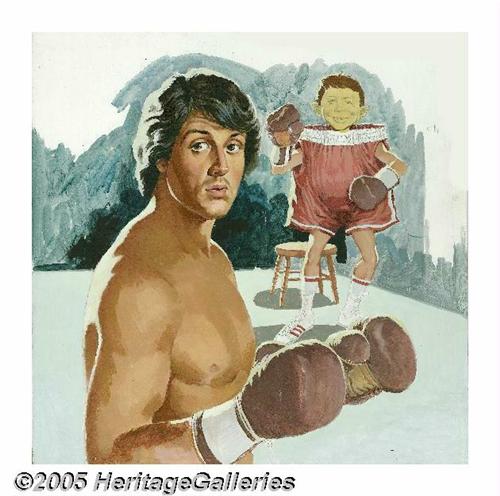 <B>Jack Rickard - Mad #194 Preliminary Cover Original Art (Mad, 1977).</B></I> The <B>Mad</B></I> legacy continues in this cover parody of "Rocky," featuring the "Italian Stallion" vs. a gap-toothed imp in a pair of oversized trunks. I guess Alfred E. Neuman figures he can't be hit below the belt! The image area measures 21.5" x 20", and the art is in Excellent condition.