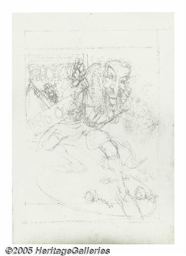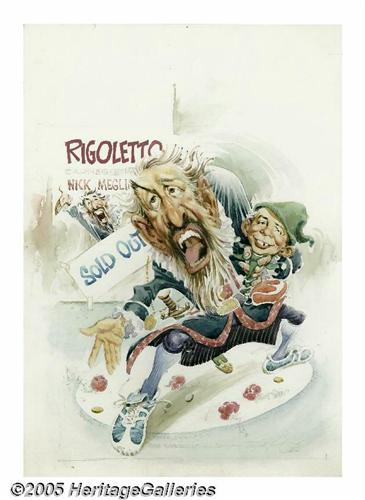 <B>Jack Rickard - Mad Co-Editor Nick Meglin as Rigoletto Caricature Illustration Original Art (1982).</B></I> In this outrageous caricature by Jack Rickard, <B>Mad</B></I> co-editor Nick Meglin grabs the limelight, starring as a contemporary version of "Rigoletto," the hunchbacked jester from Giuseppe Verdi's famous opera. The piece was lightly inscribed in pencil, "Nick ... Many huzzahs and standing ovations from Patruccio -- Jack Rickard '82." The piece was painted on illustration board, and the overall size of the piece measures 13.5" x 19". The art is in Excellent condition.