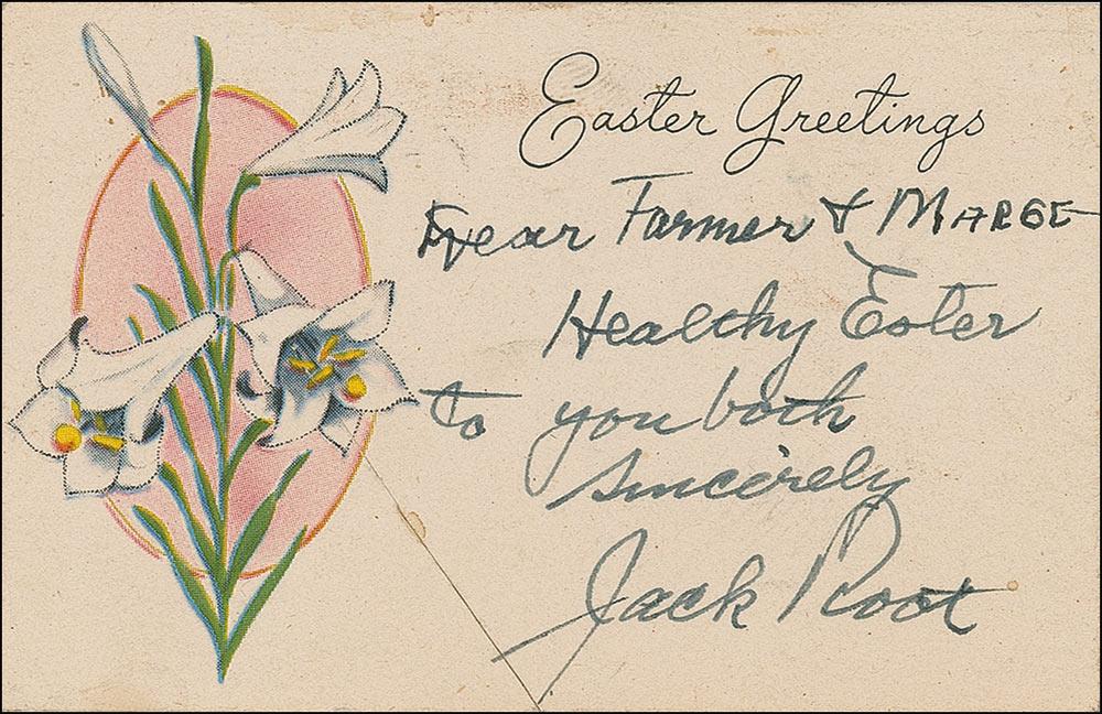 Boxer (1876–1963) who was the first light heavyweight champion of the world and is now one of the newest members of the Boxing Hall of Fame. Easter greeting tag, 3.5 x 2.25, with a color image of lilies on the left side, signed and inscribed in fountain pen, “Dear Farmer & Marge, Healthy Ester [sic] to you both, Sincerely, Jack Root.” Diagonal separation to bottom portion, trivially touching first stroke of signature, and some scattered light toning and soiling, otherwise fine condition.