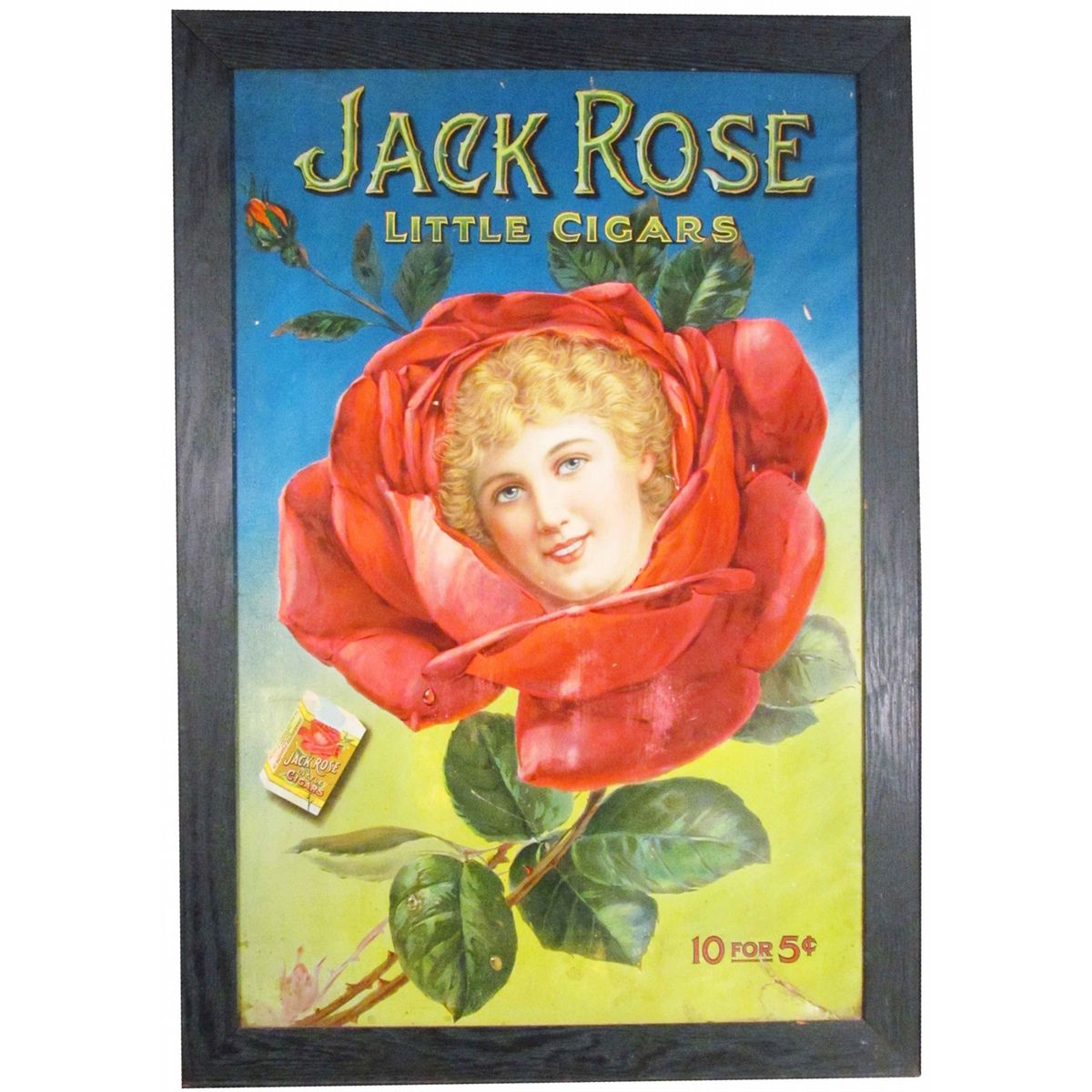 Jack Rose little Cigars, cardboard sign in original frame. Tear at bottom right, some staining and horizontal crease at top, otherwise good condition. 23 X 33 inches overall.