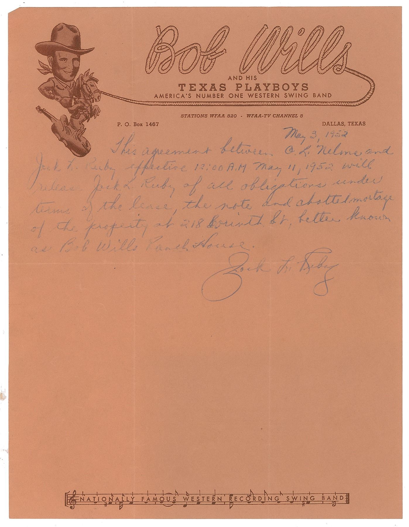 ADS signed "Jack L. Ruby," one page, 8.5 x 11, Bob Willis and His Texas Playboys letterhead, May 3, 1952. Handwritten document incorporating his name twice, in full: "This agreement between O. L. Nelms and Jack L. Ruby effective 12:00 AM May 11, 1952 will release Jack L. Ruby of all obligations under terms of the lease, the note and chattel mortgage of the property at 218 Corinth St., better known as Bob Willis Ranch House." In fine condition, with decreased ink flow affecting some of the words. In 1952, Ruby borrowed money to purchase the Bob Willis Ranch House, a Western-themed club located near the center of downtown Dallas, at the corner of Industrial Blvd. and Corinth St. Financial difficulties forced him to give up the Ranch House later that year.