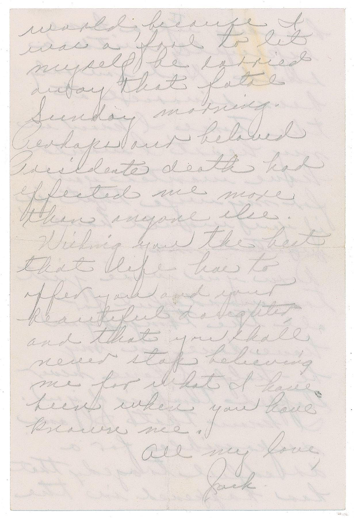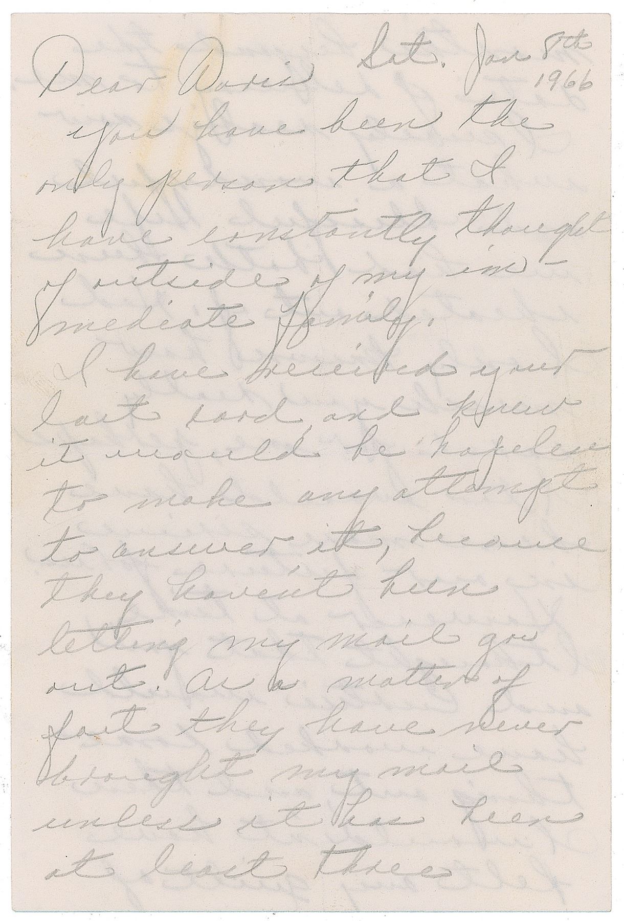 ALS in pencil, signed “Jack,” two pages both sides, 4 x 6, January 8, 1966. Letter to a girlfriend, "Doris," written while imprisoned, in part: "You have been the only person that I have constantly thought of outside of my immediate family. I have received your last card and know it would be hopeless to make any attempt to answer it, because they haven't been letting my mail go out…I surely realize now what a wonderful and blissful life we had both been cheated out of. Had I only known how much you really cared for me, perhaps I too would have been more serious in our future for us…I know that I am responsible for a dreadful tragedy that has happened in the world, because I was a fool to let myself be carried away that fatal Sunday morning. Perhaps our beloved President's death had effected me more than anyone else." In fine condition, with a faint paperclip impression to the top edge. Accompanied by a letter from Doris to Ruby, four pages, November 22, 1965, informing him of her divorce, updating him on her family, and offering words of support regarding the possible commutation of his sentence.