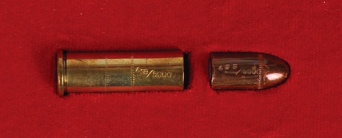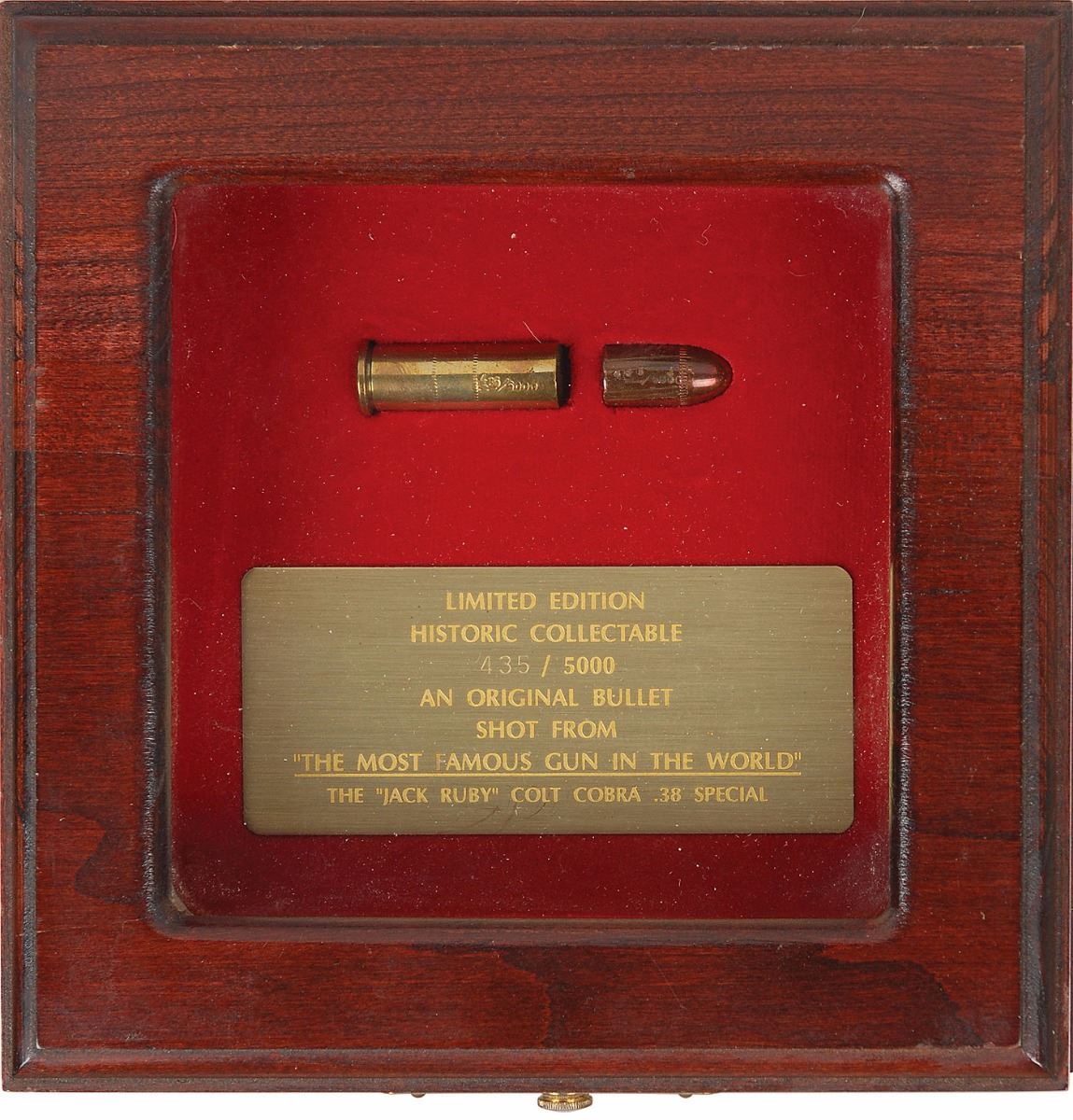 A bullet shot by the actual .38 caliber Colt Cobra revolver, Serial #2744 LW, used by Jack Ruby to shoot Lee Harvey Oswald on November 24, 1963, in the basement at Dallas Police Headquarters, along with its spent cartridge case. Bullet and casing are housed in a 6 x 6 wooden display case with a plaque which reads: “Limited Edition Historic Collectable, 435/5000, An original bullet shot from the ‘Most Famous Gun in the World.’ The ‘Jack Ruby’ Colt Cobra .38 Special.” In fine condition, with the bullet and casing stamped with their corresponding numbers.