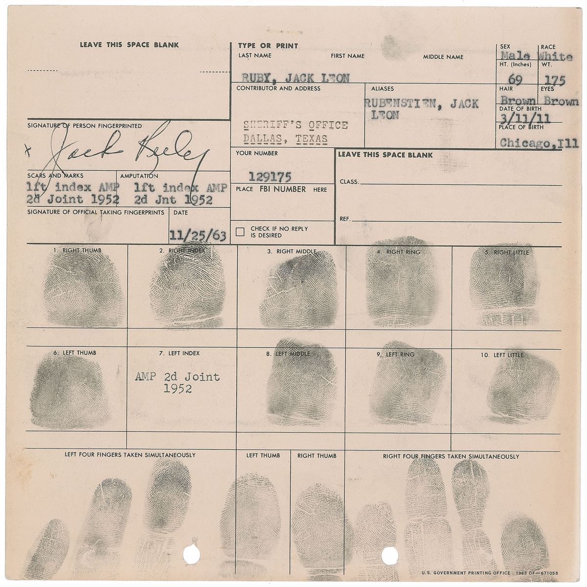 This material originates from the collection of James Cron, who worked as a civilian employee of the Dallas Police Department from 1958 to 1964, and as a deputy sheriff with the Dallas County Sheriff's Office from 1964 to 1993, where he served as a crime scene investigator. Cron created the Physical Evidence Section and was its Lieutenant Commander until his retirement; he now serves as a crime scene consultant. While in these positions he met many figures associated with the Kennedy and Oswald investigations, and was able to save some files and documents from those marked for destruction, receiving some material from supervisors as they retired. The sheriff's office began to remove fingerprint cards from their records after instituting a computerized system. According to Cron, six fingerprint cards were created on the day Ruby entered the Dallas County Jail on November 25, 1963—two were kept by the Dallas Sheriff’s Office, one by the Texas Department of Public Safety, and three went to the FBI, making this an exceedingly rare item and quite possibly the only example in private hands.