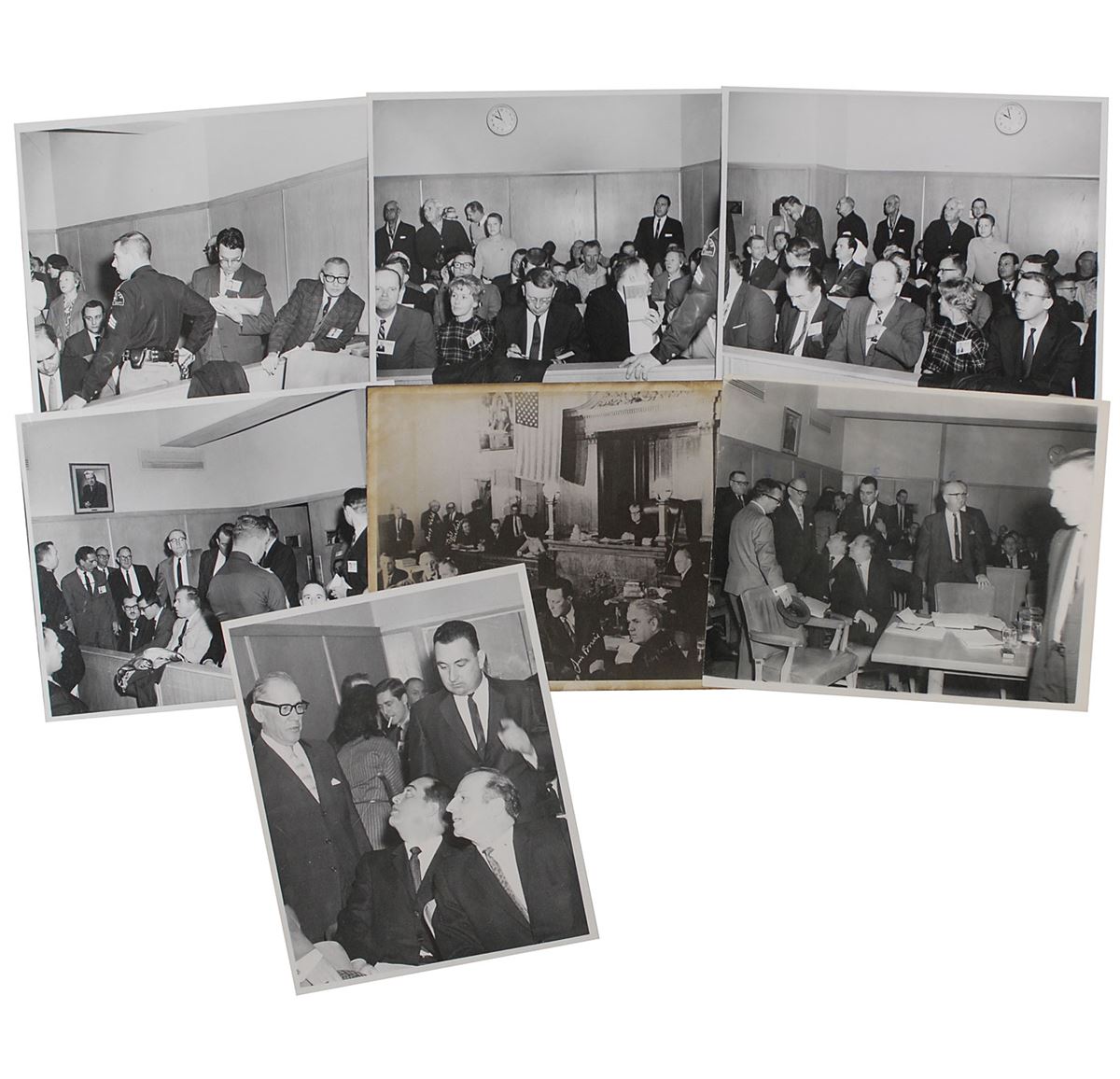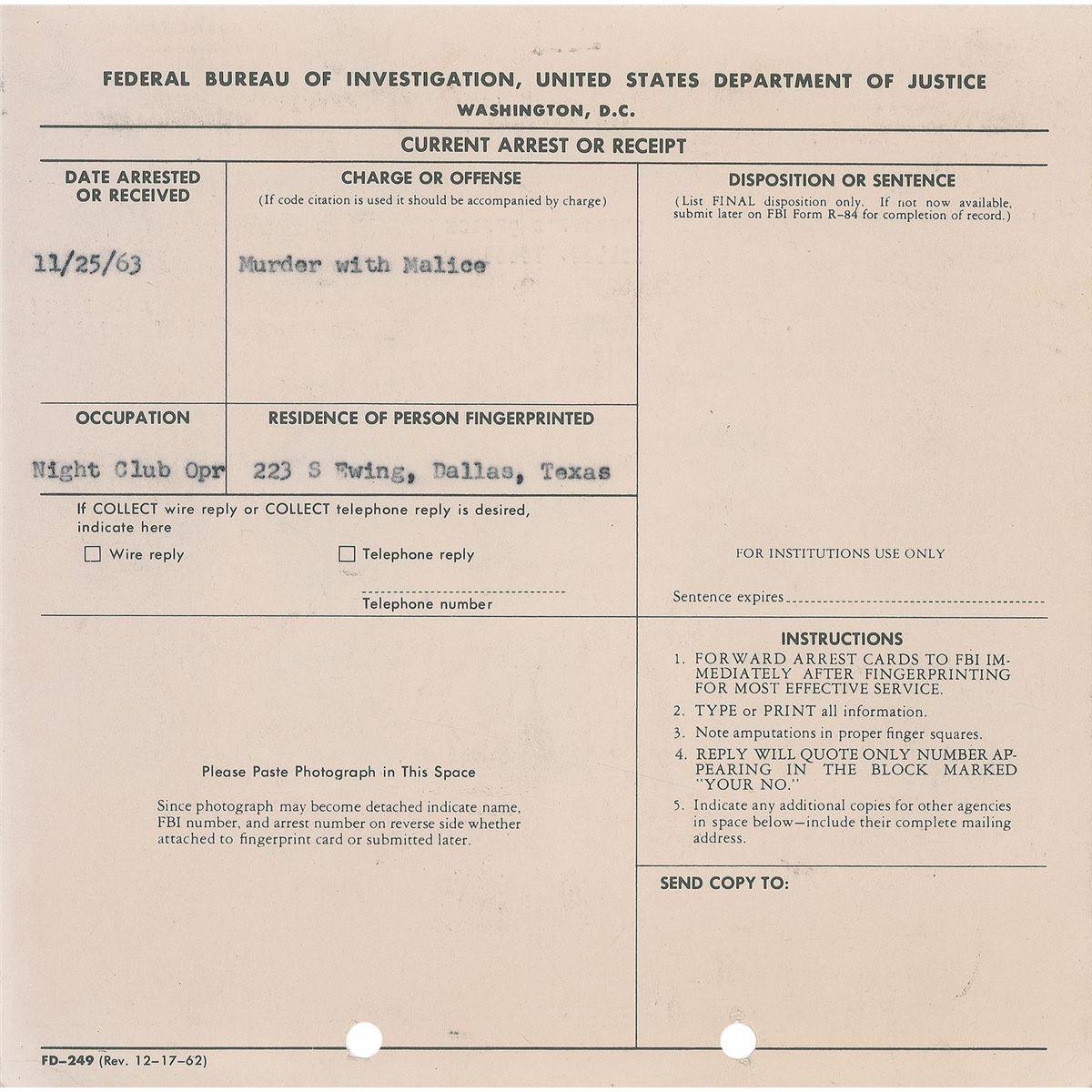 Fantastic archive of material related to Jack Ruby and the murder of Lee Harvey Oswald, highlighted by an original Ruby fingerprint card from the investigation. The fingerprint card is filled out in type and signed in black ballpoint, “Jack Ruby,” one page both sides, 8 x 8, November 25, 1963. The front of the card lists his personal and identifying information, including his name, “Ruby, Jack Lyon”; alias, “Rubenstein, Jack Lyon”; his Sheriff’s Department file number, “129175”; and amputation, “left index AMP 2d Jnt 1952.” The lower portion contains the original ink prints of all fingers and thumbs individually (except the amputated left index finger), as well as all nine prints taken simultaneously. The reverse lists his arrest information, including the date arrested, “11/25/63,” and charges or offense, “Murder with Malice.” Also present are two original small glossy booking photos of Ruby, one showing him standing up and the other a mugshot of his face and profile. The rest of the archive comprises 18 original period photos, including one of the sheriff’s office in the jail on the day Ruby was arrested, several of Ruby’s trial, and many of the Texas School Book Depository; some photocopied documentation from the trial is also included. In overall fine condition, and accompanied by a notarized letter of provenance from James Cron. An absolutely outstanding collection of the utmost historical importance.