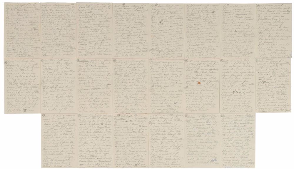 Handwritten manuscript in pencil by Jack Ruby, unsigned, 24 pages on 22 sheets, 4 x 6, written after he was convicted of the murder of Lee Harvey Oswald and sentenced to death. The important manuscript details his movements on the evening of Friday, November 22, 1963, and the early hours of Saturday morning on November 23rd. Earl Ruby, the brother of Jack Ruby, notes that this manuscript was to be used by Jack's lawyers if a new trial was granted to show that Jack's motives in the murder were not premeditated.