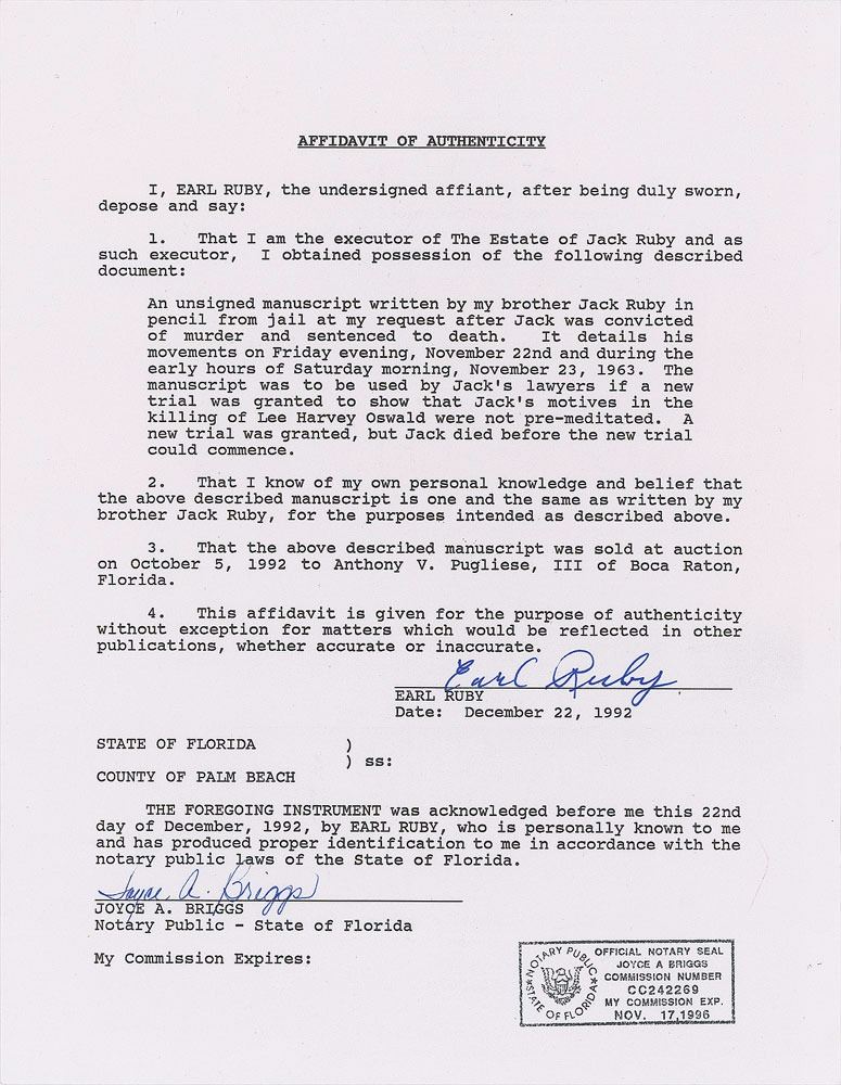 A. Asked the boys at the station what food Mrs. McClendon brought to them…B. I asked the boys in the station, what time Gordon had left, and also remarked it was rather strange that I couldn’t find Joe DeLong at the Police Station…C. Also emphasized that they would never believe what trouble I went through getting their sandwiches to them. D. Mentioned to Russ about getting the wrong number Christine gave me and he said I'll bet that she gave you the number that has been discontinued. E. I intended to send flowers where the president was shot, but I came to my sister’s apartment and mentioned it to her she said don’t send them from the same florist because the flowers are stale.” In fine condition. Accompanied by an affidavit signed by Earl Ruby describing the circumstances in which this manuscript was written.
