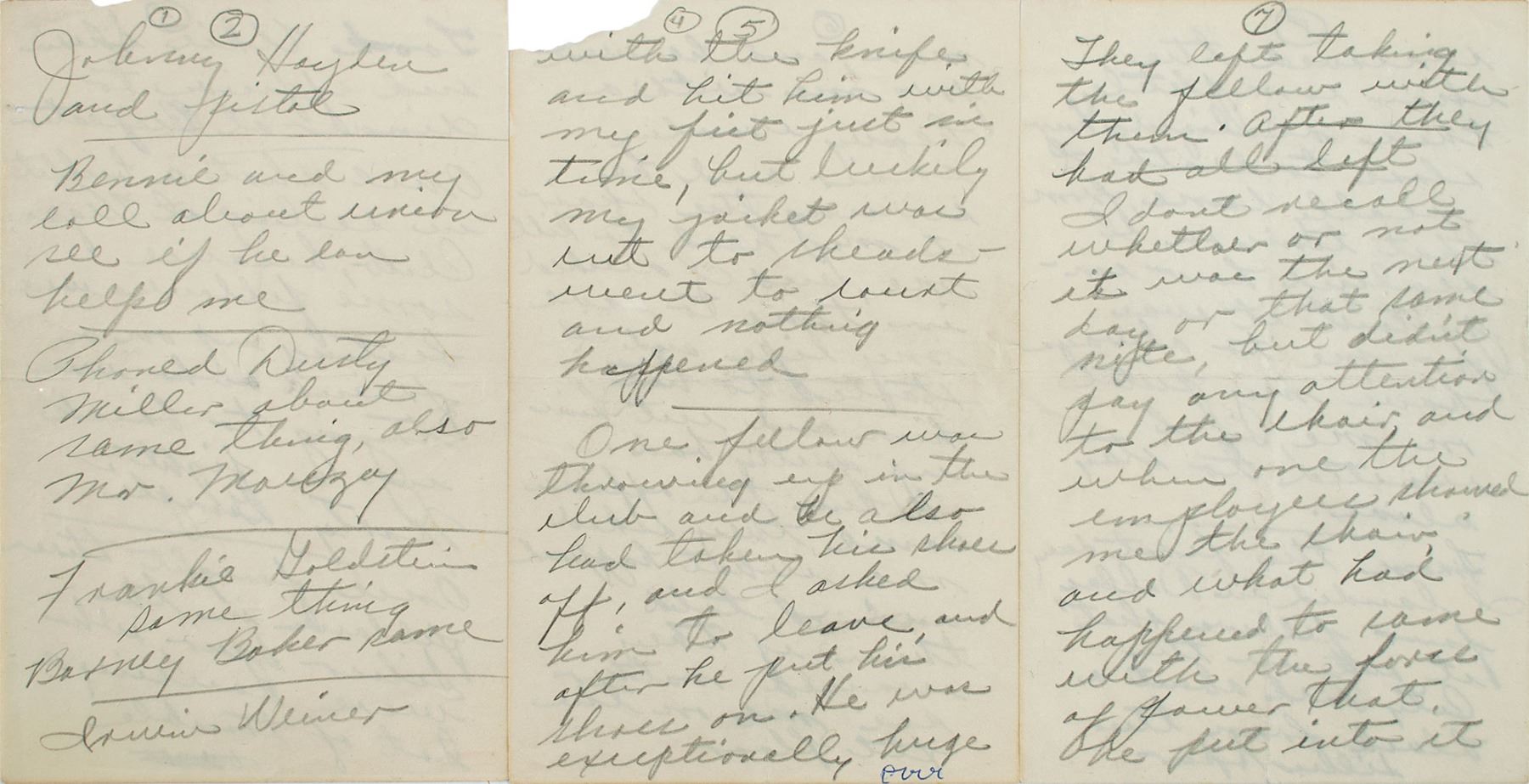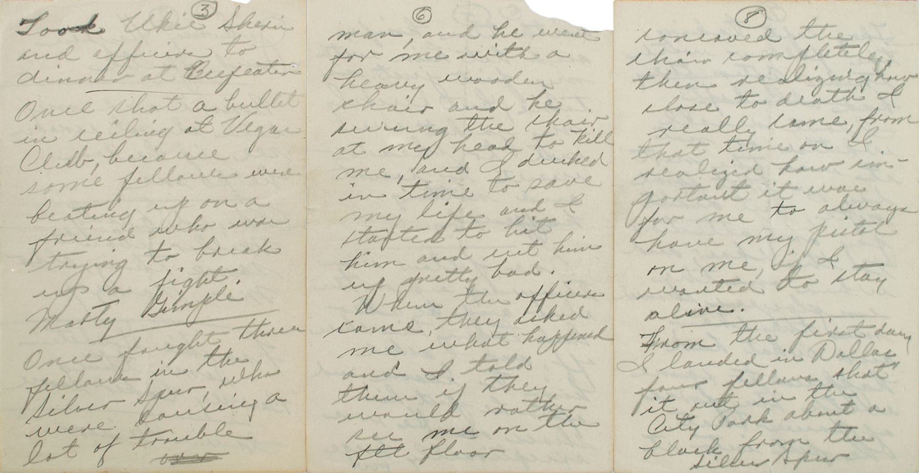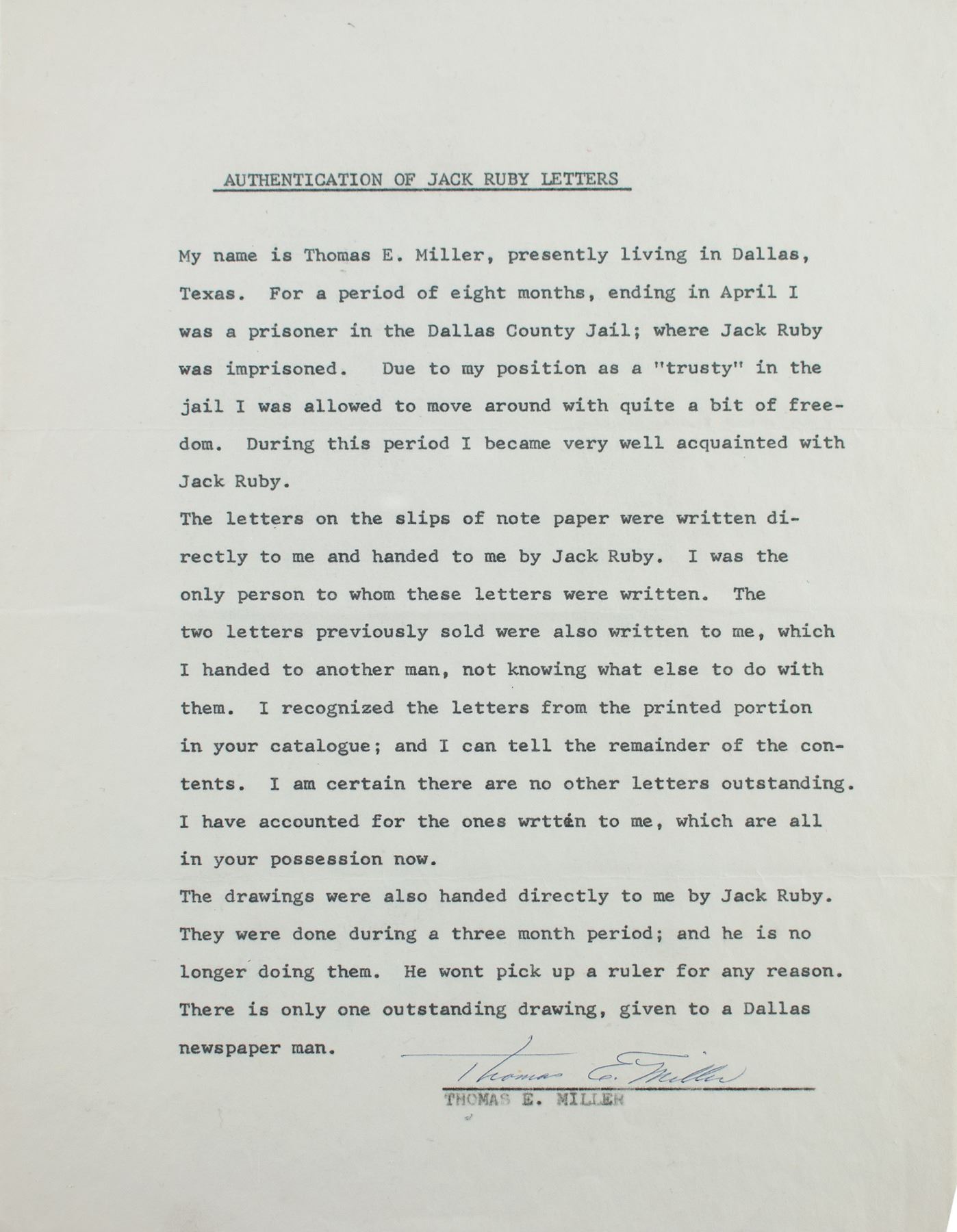 Unsigned handwritten notes in pencil by Jack Ruby, three pages both sides, 4 x 6, no date but written while imprisoned. Ruby relates stories of himself being a 'tough guy,' in part: "Once shot a bullet in ceiling at Vegas Club, because some fellowes were beating up on a friend who was trying to break up a fight…Once fought three fellowes in the Silver Spur, who were causing a lot of trouble with the knife and hit him with my fist just in time, but luckily my jacket was cut to shreds—went to court and nothing happened—One fellow was throwing up in the club and he also had taken his shoes off, and I asked him to leave, and after he put his shoes on, he was exceptionally huge man, and he went for me with a heavy wooden chair and he swung the chair at my head to kill me, and I ducked in time to save my life and I started to hit him and cut him up pretty bad. When the officers came, they asked me what happened and I told them if they would rather see me on the floor They left taking the fellow with them. I don't recall whether or not it was the next day or that same nite, but didn't pay any attention to the chair, and when one of the employees showed me the chair and what had happened…he…then realized how close to death I really came, from that time on I realized how important it was for me to always have my pistol on me, if I wanted to stay alive." In fine condition. Accompanied by a letter of authenticity from Thomas E. Miller, who was imprisoned with Ruby in the Dallas County Jail.