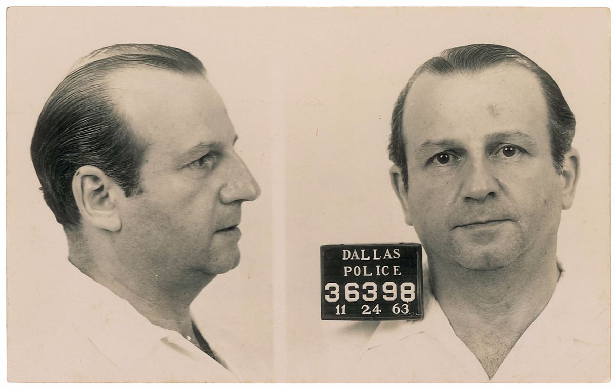 Official vintage glossy 4.75 x 3 Dallas Police Department mug shot photo of Ruby, featuring side-by-side images of him facing front and to his left. The Dallas Police placard in the image identifies the suspect number as “36398” and date as “11-24-63.” Reverse is stamped with blank areas for the suspect’s information, which are not filled out. In fine condition, with a few slight surface creases. A historic and extremely scarce original photo.