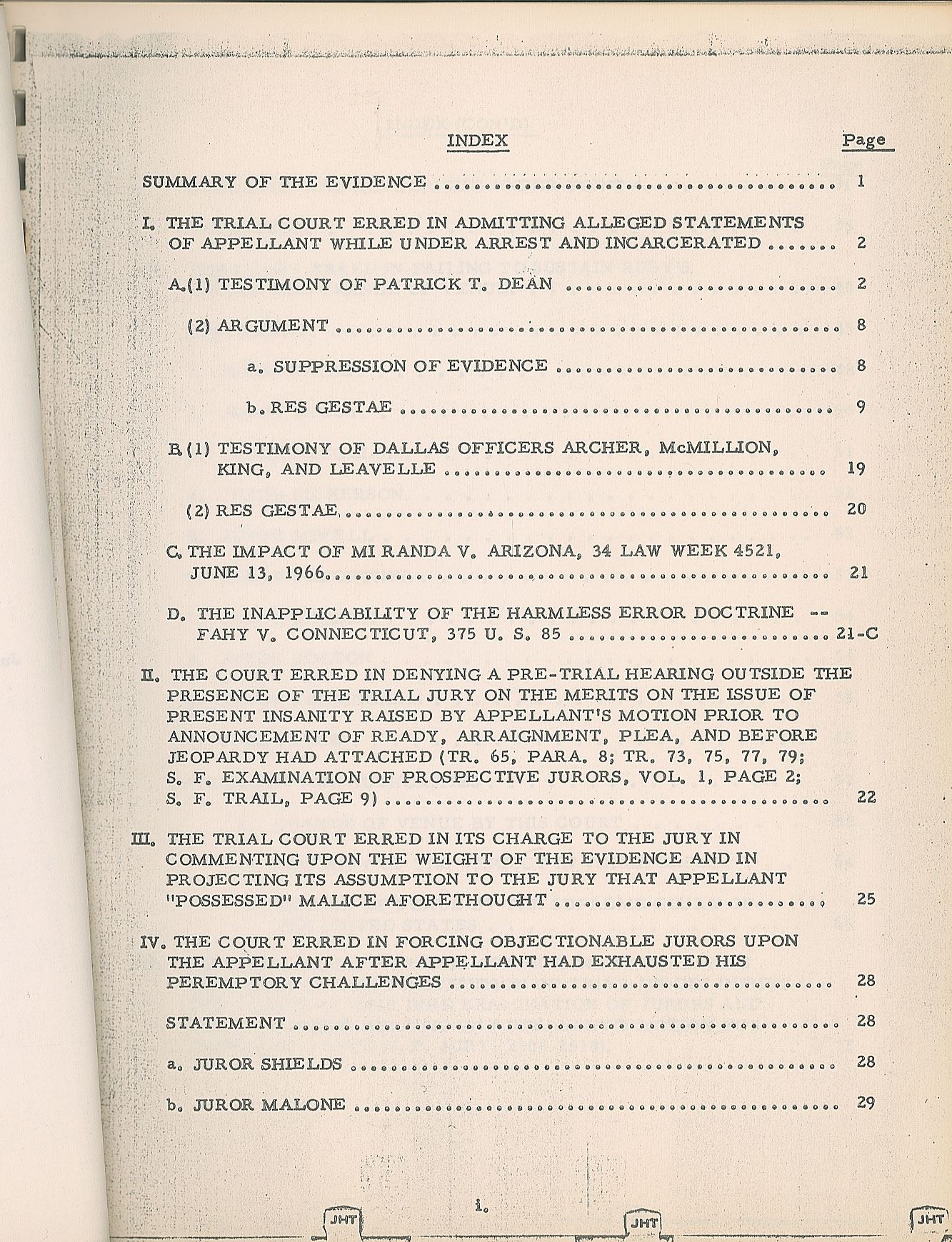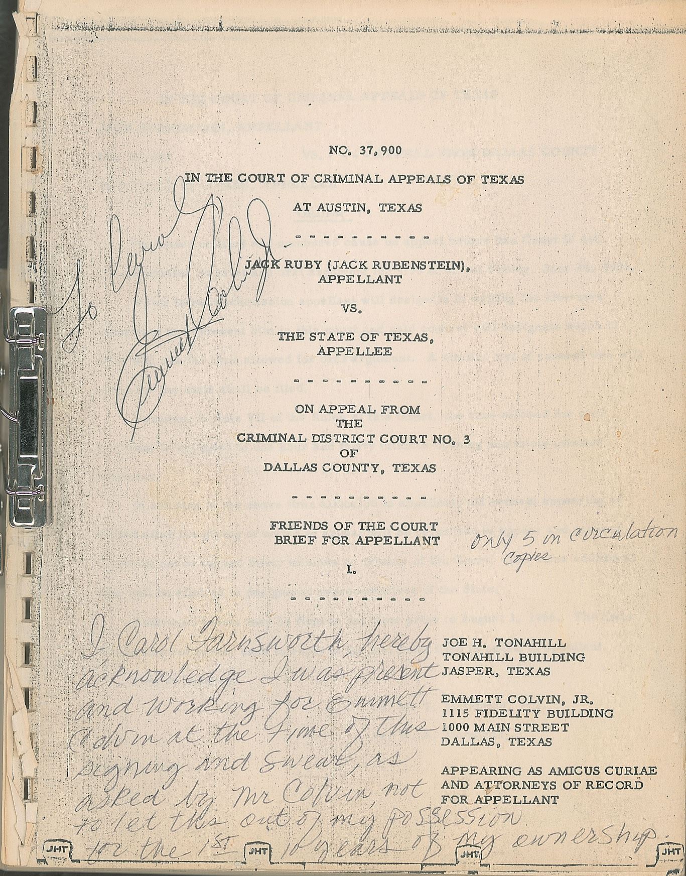 Bound copy of papers from the case of "Jack Ruby (Jack Rubenstein), Appellant, vs. The State of Texas," 9.5 x 11.5, 83 pages, signed and inscribed on the first page in ballpoint by one of Ruby's lawyers, "To Carol, Emmett Colvin, Jr." Also annotated by the recipient, "Only 5 copies in circulation, I, Carol Farnsworth, hereby acknowledge I was present and working for Emmett Colvin at the time of the signing and swear, as asked by Mr. Colvin, not to let this out of my possession for the 1st 10 years of ownership." The papers outline Ruby's complaints against the court—that it erred in admitting certain statements made by Ruby while under arrest and incarcerated, that a pre-trial hearing was denied, that the jury was improperly selected, and that his motion for a change of venue was denied. In fine condition.