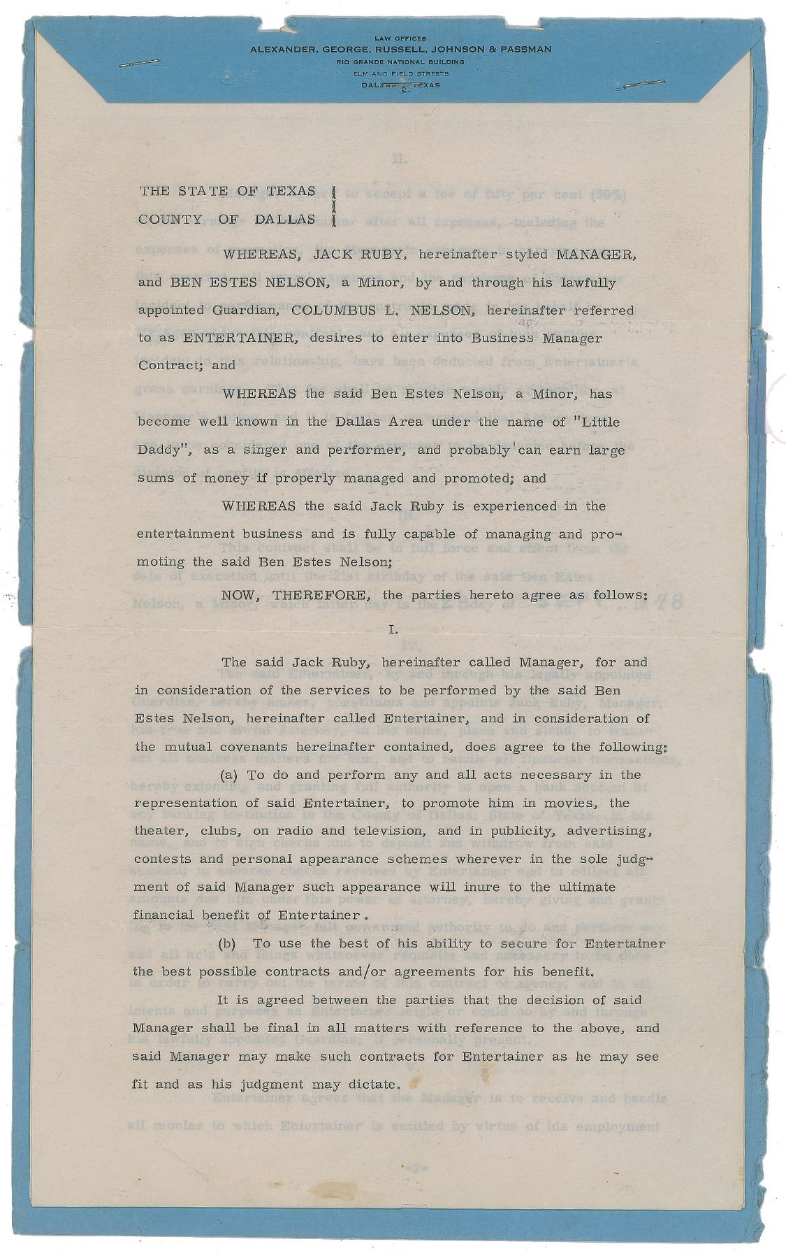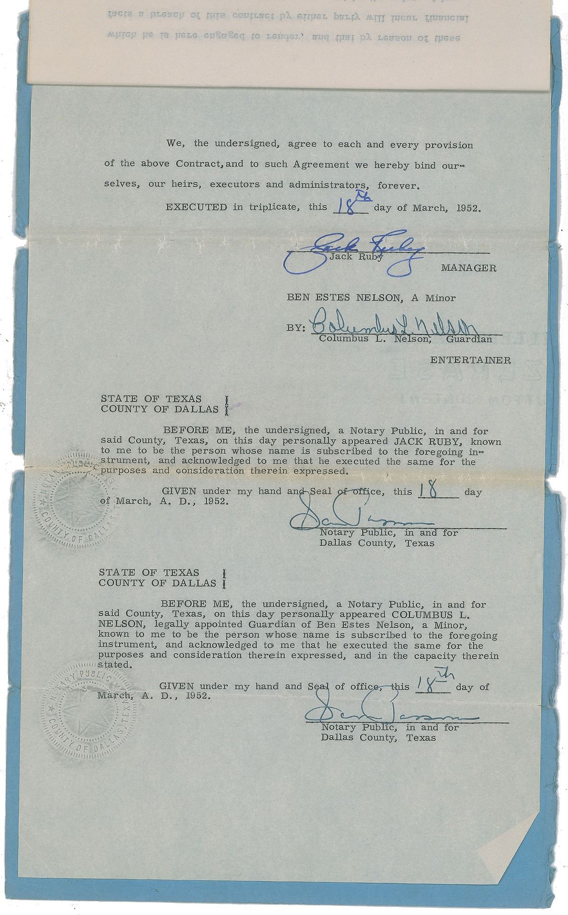 DS, signed “Jack Ruby,” five pages, 8.5 x 14, March 18, 1952. Contract by which Ruby becomes the manager of Ben Estes Nelson, a child who "has become well known in the Dallas Area under the name of 'Little Daddy,' as a singer and performer, and probably can earn large sums of money if properly managed and promoted." Signed at the conclusion by Jack Ruby and by Nelson's guardian, Columbus L. Nelson. In fine condition. Accompanied by a glossy 8 x 10 photo of Ruby posing with Nelson.