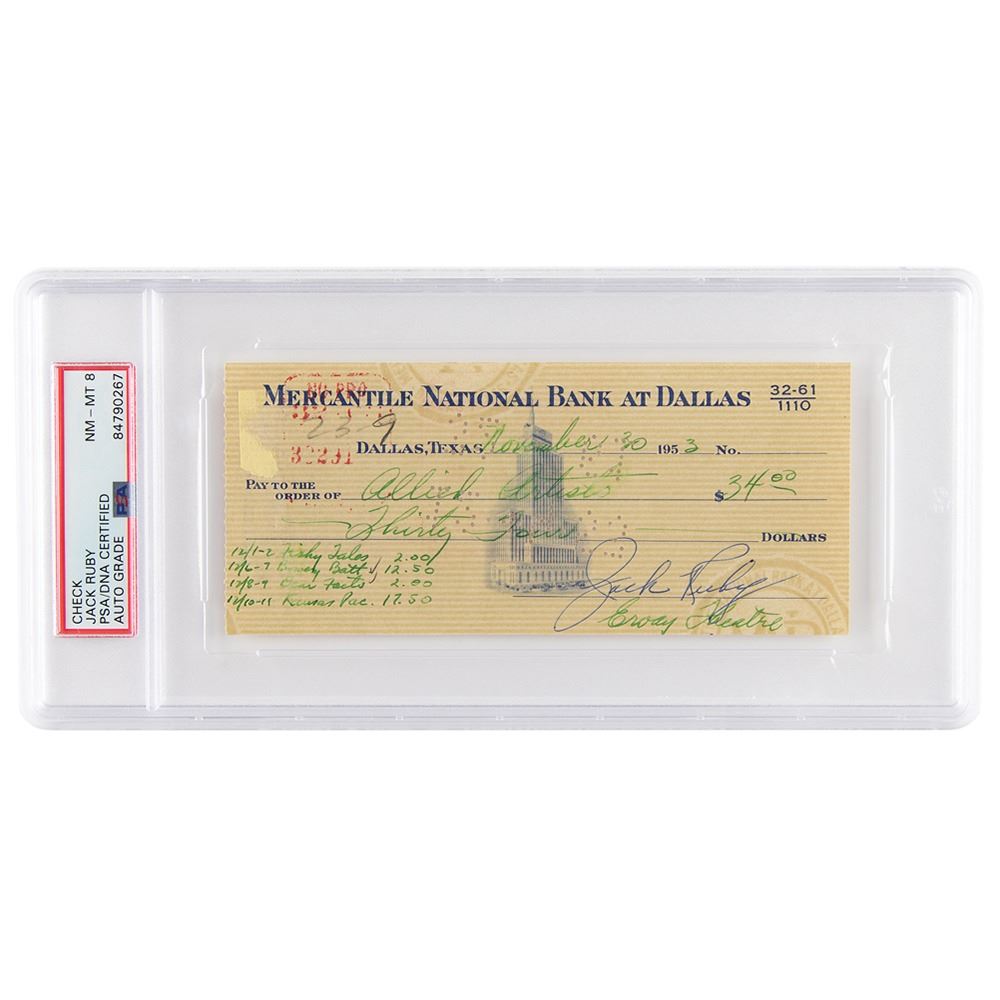 Bank check, 6 x 2.75, filled out in another hand and signed by Ruby, "Jack Ruby," payable to Allied Artists for $34, November 30, 1953. Drawn on the account of the Ervay Theatre& mdash;one of Ruby& #39;s many Dallas-area entertainment enterprises& mdash;the check& #39;s memo field notes that it represents a payment for several films. In fine condition. Encapsulated and graded by PSA/DNA as "NM-MT 8."