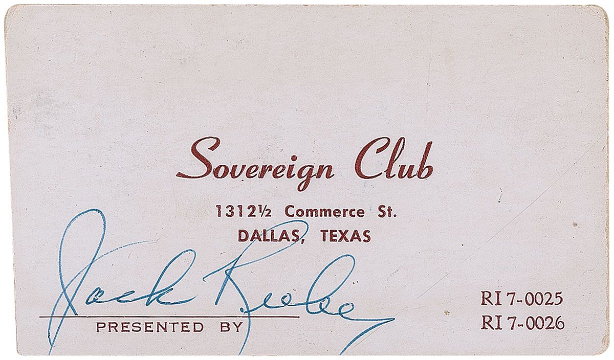 Business card from Ruby’s Sovereign Club in Dallas, 3.25 x 2, signed in the lower left in blue ballpoint by Ruby. In fine condition, with a slightly trimmed left edge.