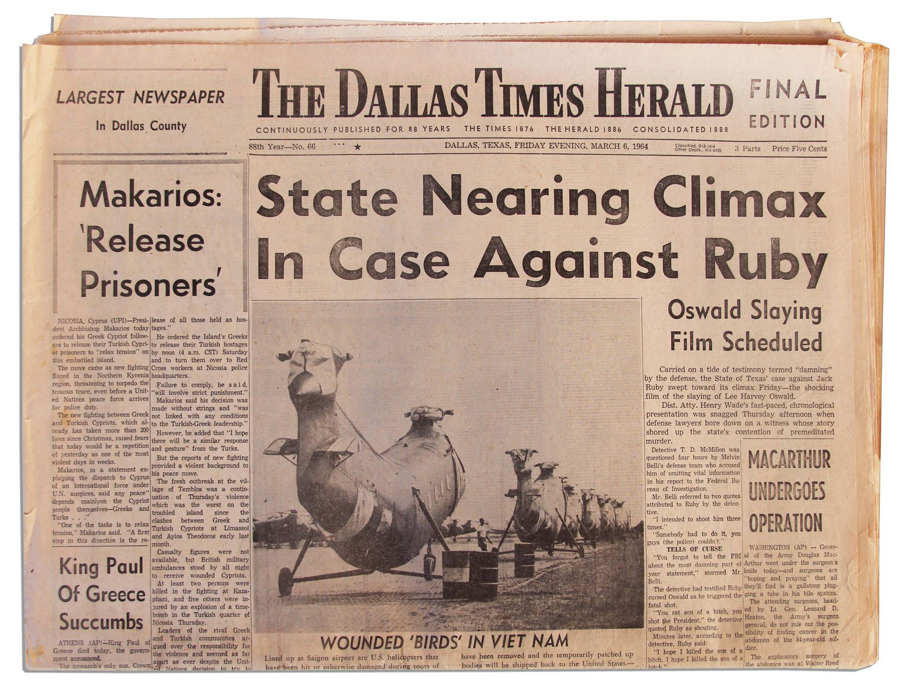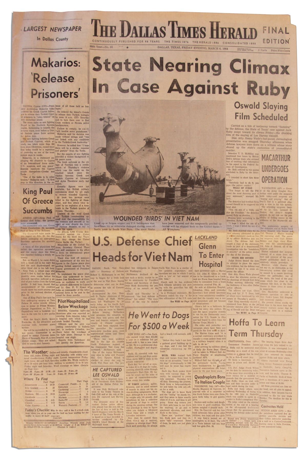 6 March 1964 edition of the ''Dallas Times Herald'' newspaper covering the trial of Jack Ruby. Ruby was ultimately convicted of murdering JFK's suspected assassin Lee Harvey Oswald. Paper announces the plan of the Dallas district attorney's office to show the jury recorded footage of Ruby shooting Oswald. The front page article also reveals Detective T.D. McMillon's ''damning'' testimony against Ruby. Other stories cover the ongoing war in Vietnam. Section A only runs 22pp. Toning with some tears along left edge and chip to upper right corner of front page, else near fine.