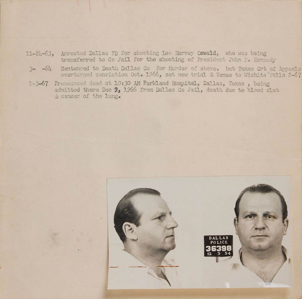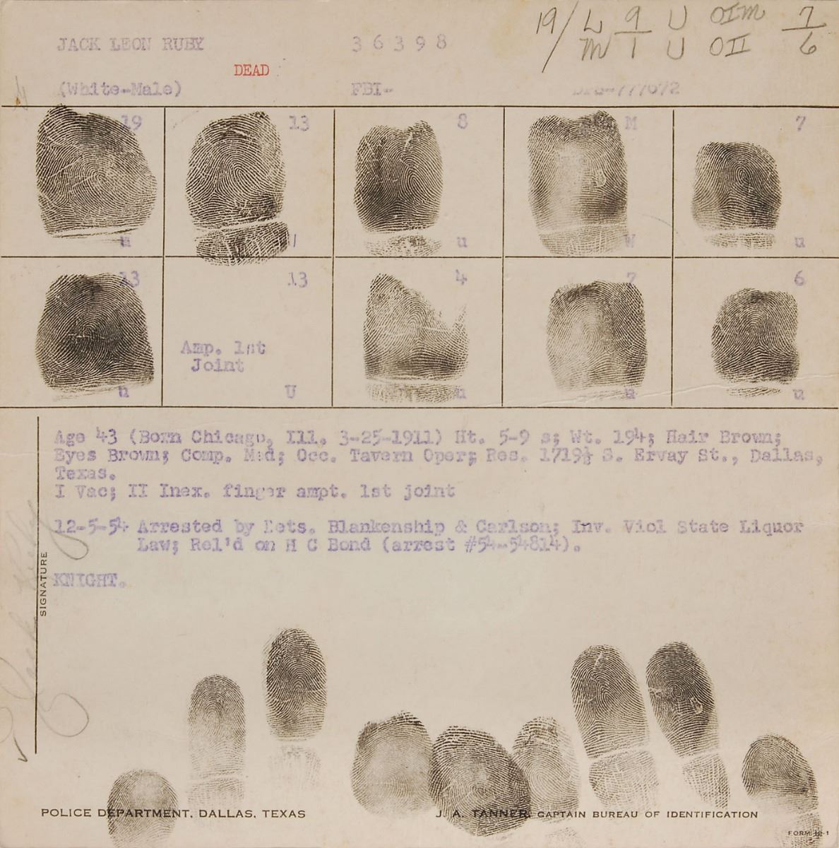Unique original fingerprint card from the Dallas Police Department, filled out in type and signed in the lower left in pencil, “Jack Ruby,” one page both sides, 8 x 8, December 5, 1954. The card bears Ruby’s fingerprints individually—except for the left index finger, where it notes, “Amp. 1st joint”—as well as all nine prints taken simultaneously at the bottom. The arrest description is typed in the center: “Arrested by Dets. Blankenship & Carlson; Inv. Viol State Liquor Law; Re’d on H C Bond (arrest #54-54814).” Affixed to the reverse is Ruby’s original Dallas Police mug shot from the arrest, listing his prisoner number as “36398.” The reverse also bears typed notes on Ruby’s dealings with the DPD in the aftermath of the Kennedy assassination. These notes, in part: “11-24-63, Arrested Dallas PD for shooting Lee Harvey Oswald, who was being transferred to Co Jail for the shooting of President John F. Kennedy.” In fine condition, with light creasing and soiling.