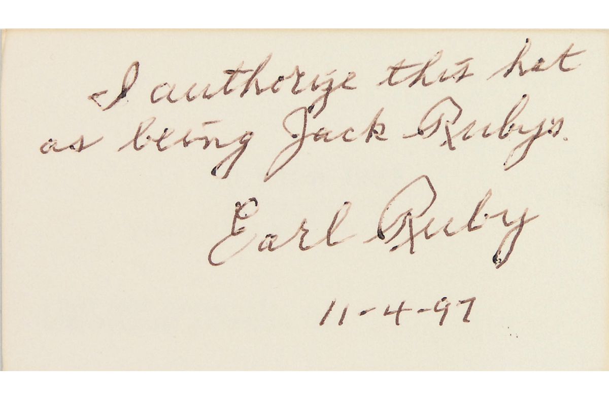 Ruby’s personally-owned and -worn hat. Gray Resistol hat with multi-colored hat band, Italian Milan style, size 7 ¾, originally purchased from Titche’s of Dallas Men’s Shop. Printed in large gold embossed capital letters on the inside hat band is “Jack Ruby.” Also included is a business card from his brother Earl Ruby, with a brief statement of provenance written on the reverse which reads, “I authorize this hat as being Jack Ruby’s. Earl Ruby, 11-4-97.” Hat comes in its original mailing box, postmarked November 5, 1997, with Earl Ruby’s return address written on the box. In very fine condition. Rarely seen out and about without a hat, Ruby was referred to as ‘the man in the hat’ immediately after shooting Oswald. At the time of the assassination, he owned three dress hats, including this classic Resistol.