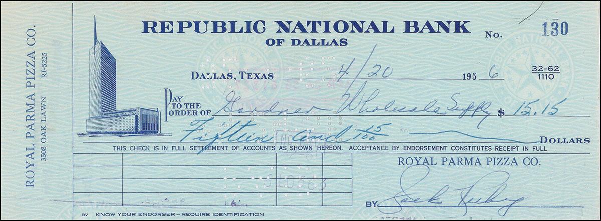 Dallas nightclub owner (1911–1967) who shot and killed Lee Harvey Oswald on November 24, 1963, two days after Oswald was arrested for the assassination of President John F. Kennedy. Royal Parma Pizza Company business check, 8.25 x 3.25, filled out in another hand and signed by Ruby, payable to Gardner Wholesale Supply for $15.15, April 20, 1956. In fine condition, with usual creases and bank cancellation holes and stamps.