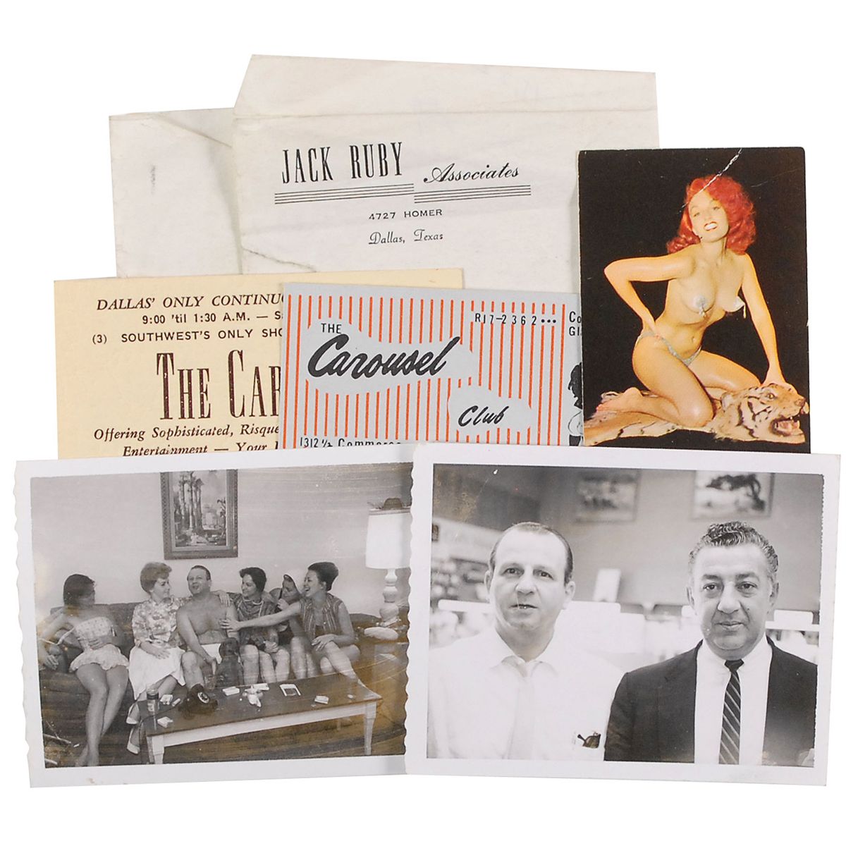 Collection of six items: two original glossy 4 x 3 candid photos, one of Ruby posing with another gentleman and one of a bathing suit-clad Ruby sitting on a sofa with five ladies; two different Carousel Club business cards; a color promotional card of Jada for Madame Francine’s; and an unused Jack Ruby Associates mailing envelope, with notations and sketches on the reverse in another hand. In fine condition, with several folds and small tears to envelope, and light creasing to color card. Items originate from the personal collection of a US Secret Service agent at the time of the assassination.